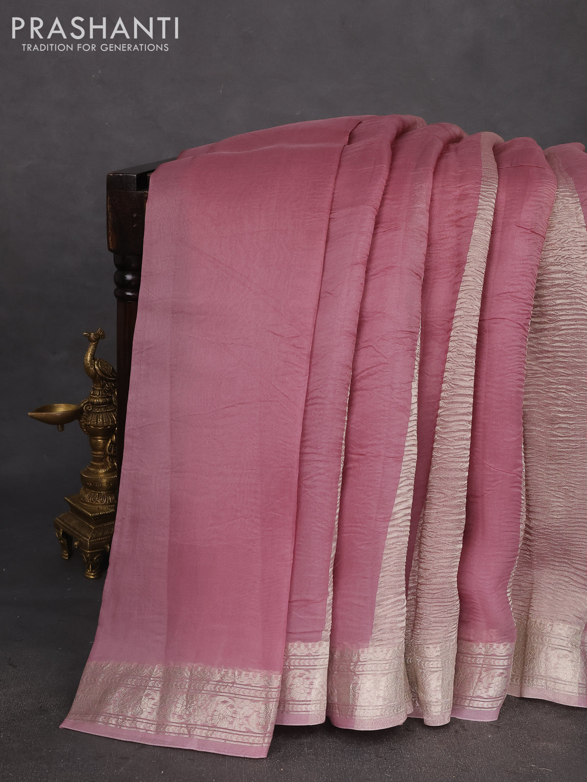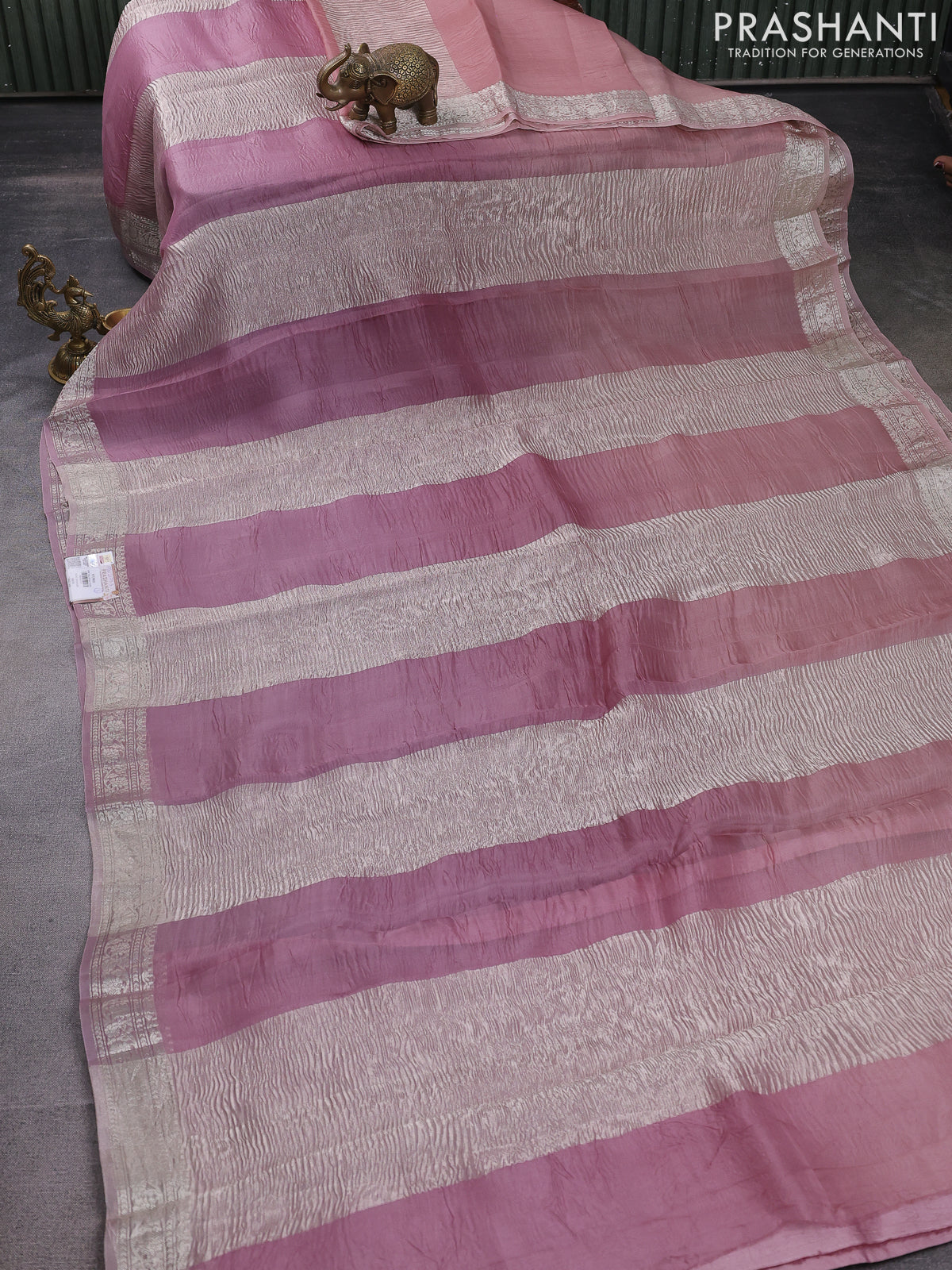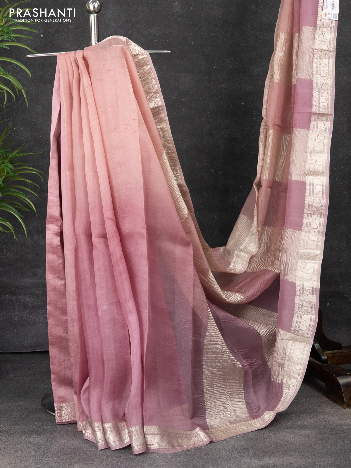 Pure organza partly silk saree pastel peach and pastel pink with silver zari stripe pattern and silver zari woven border