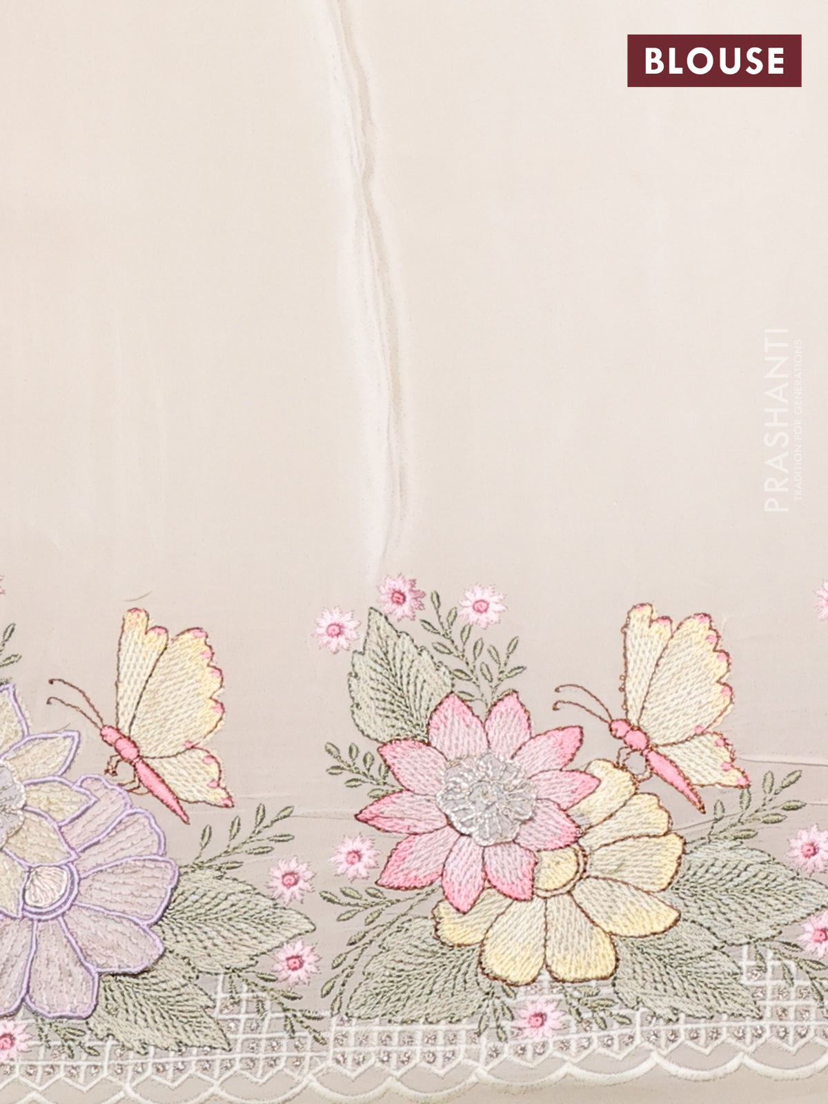 Pure organza silk saree cream with allover floral embroidery and floral design embroidery border