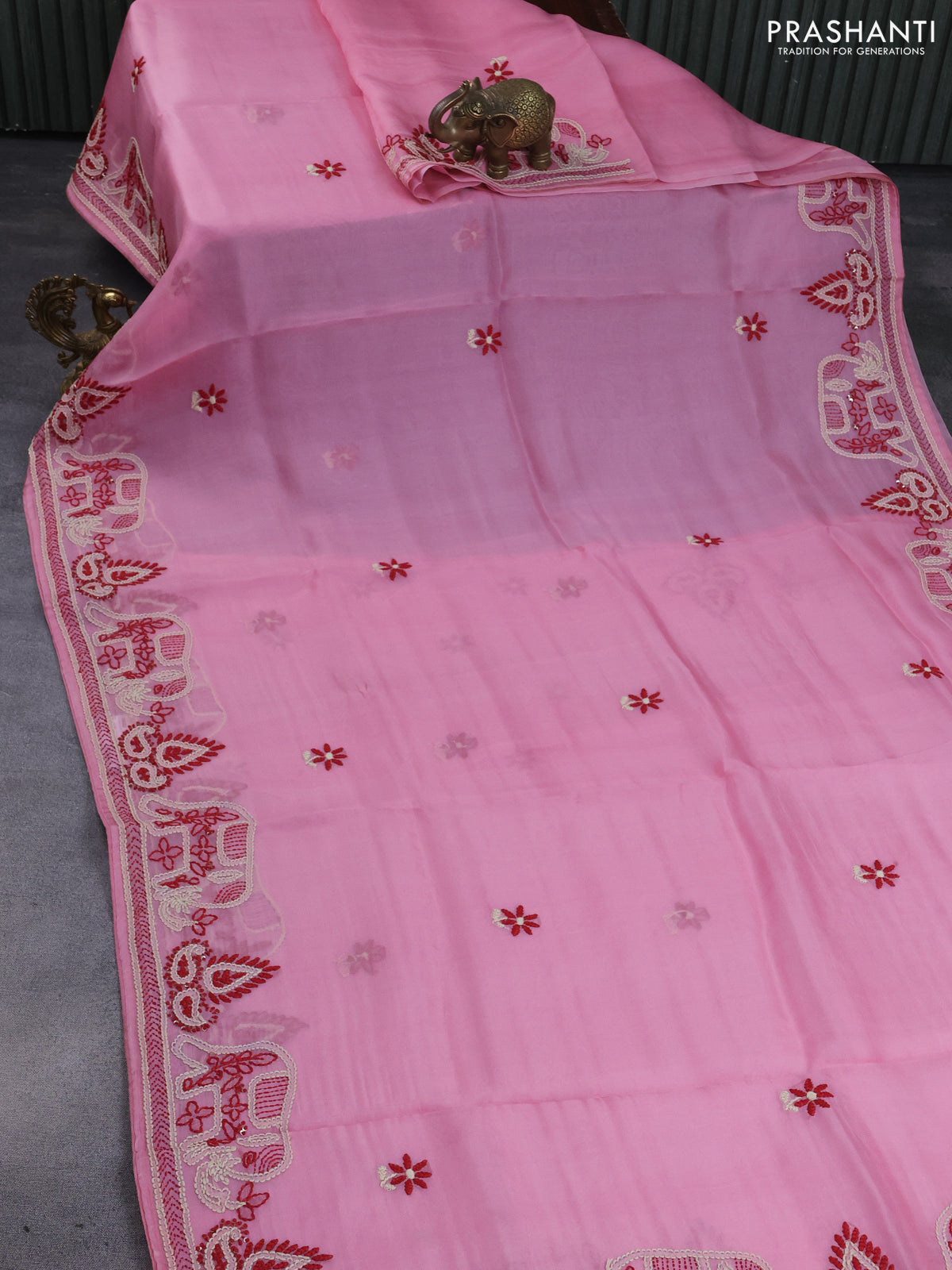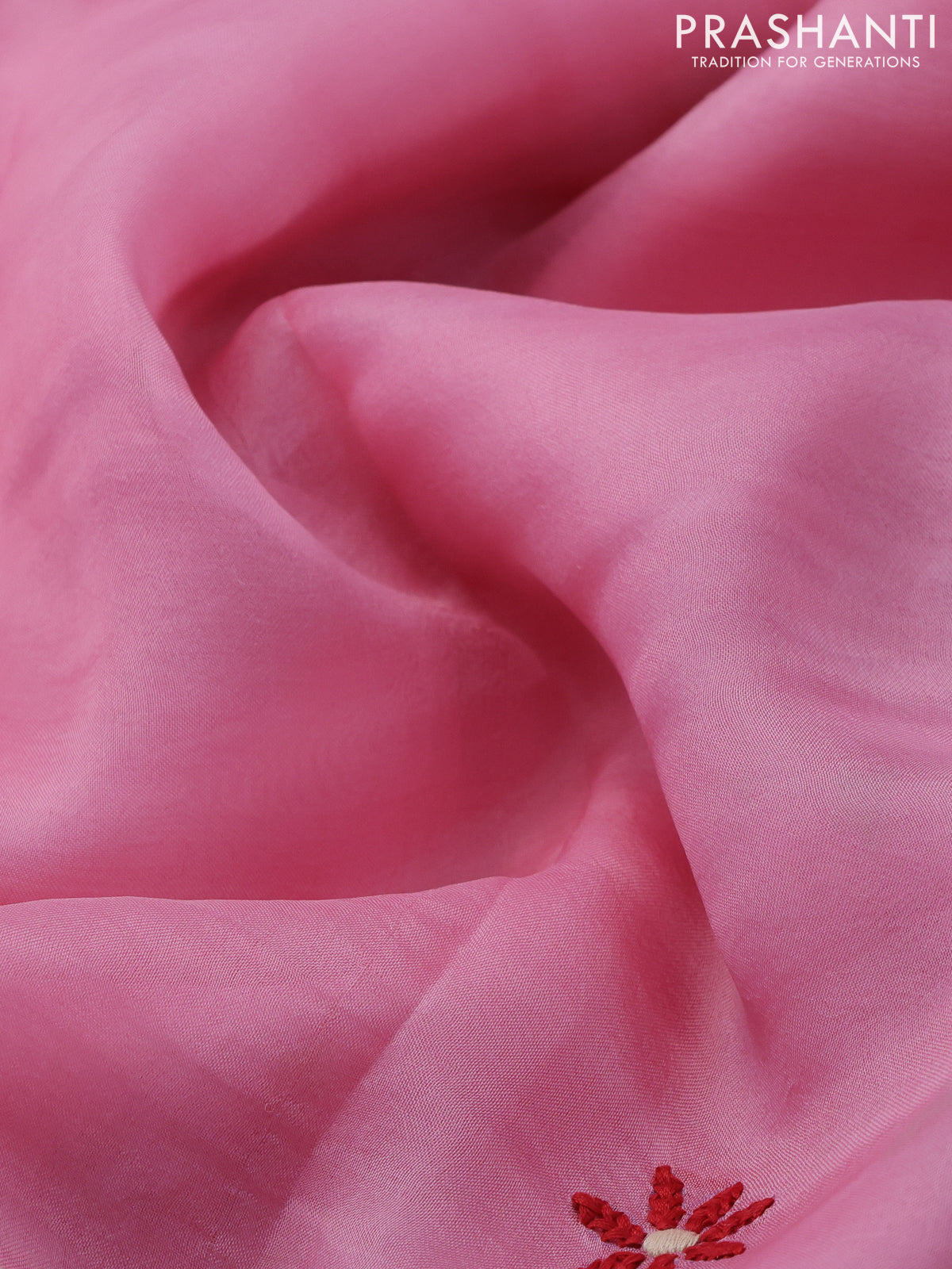Pure organza silk saree light pink with embroidery work buttas and kantha stitch work border