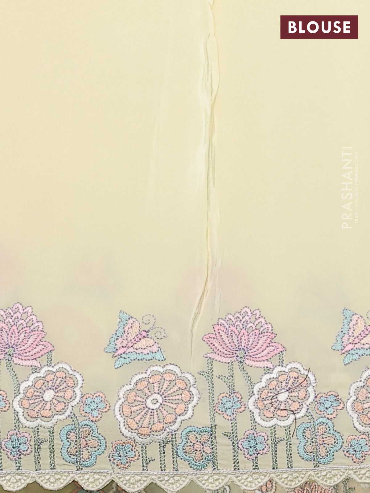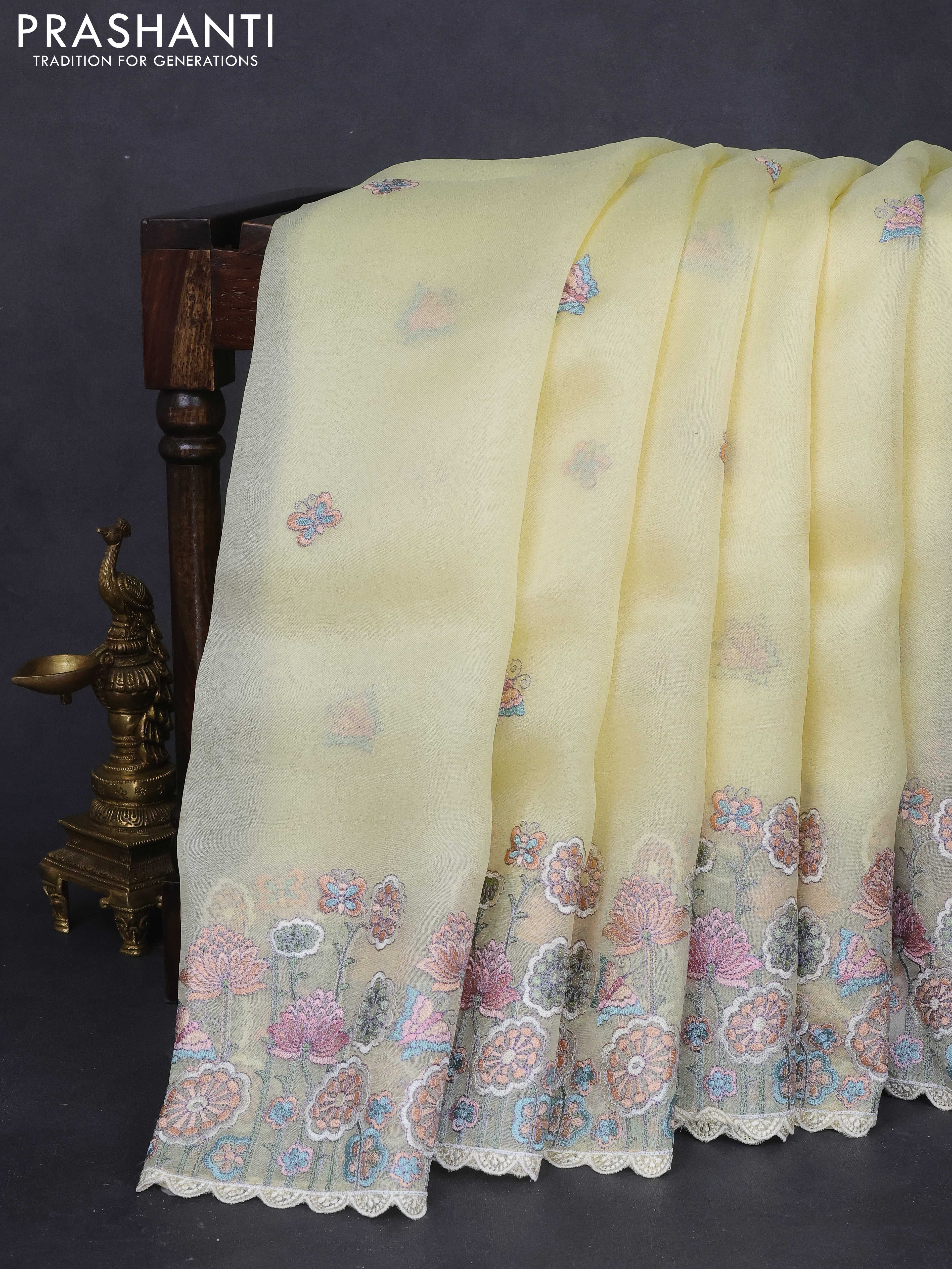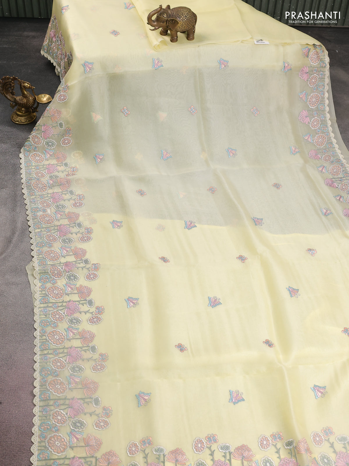 Pure organza silk saree lime yellow with butterfly embroidery and floral design embroidery border
