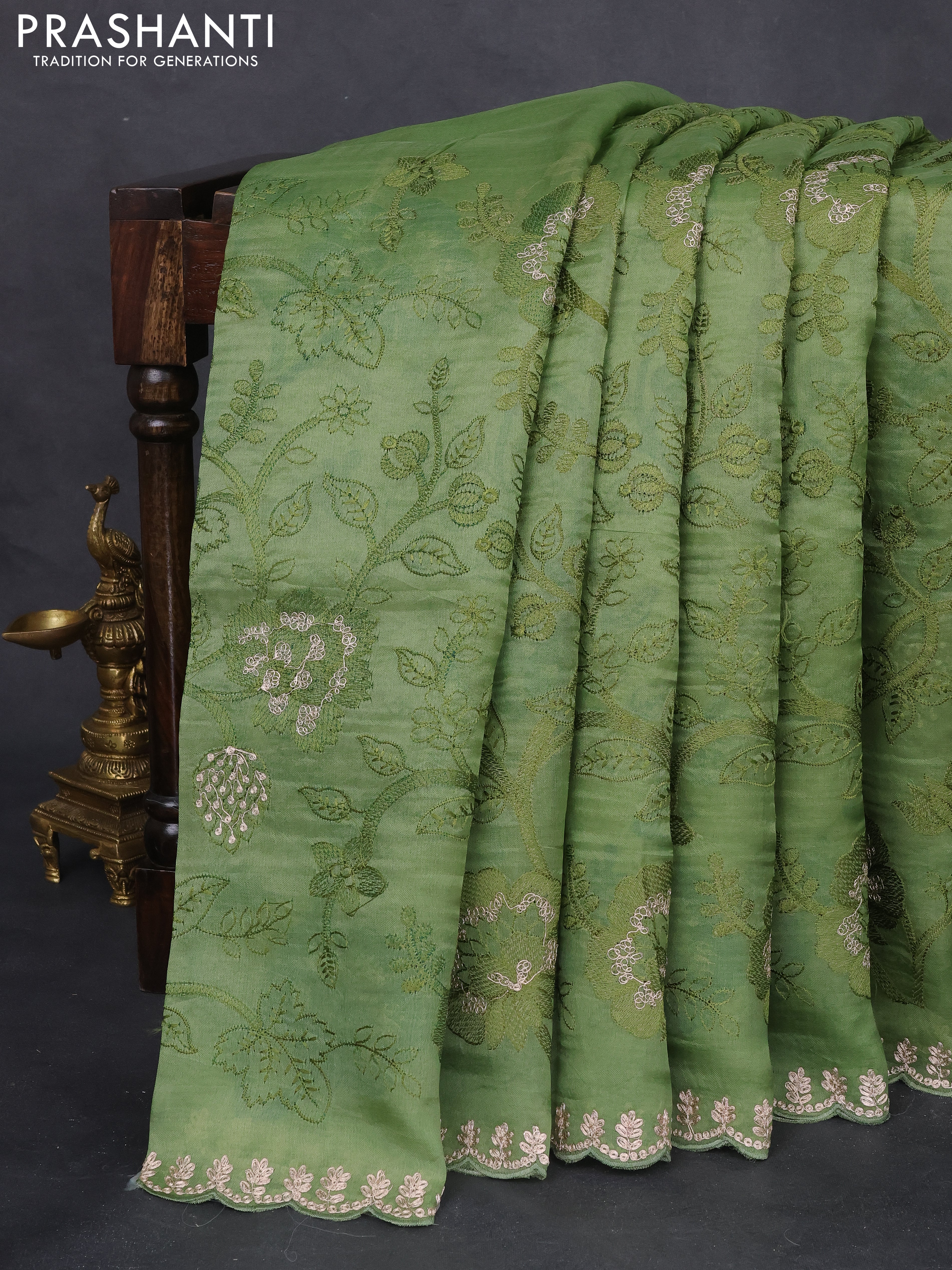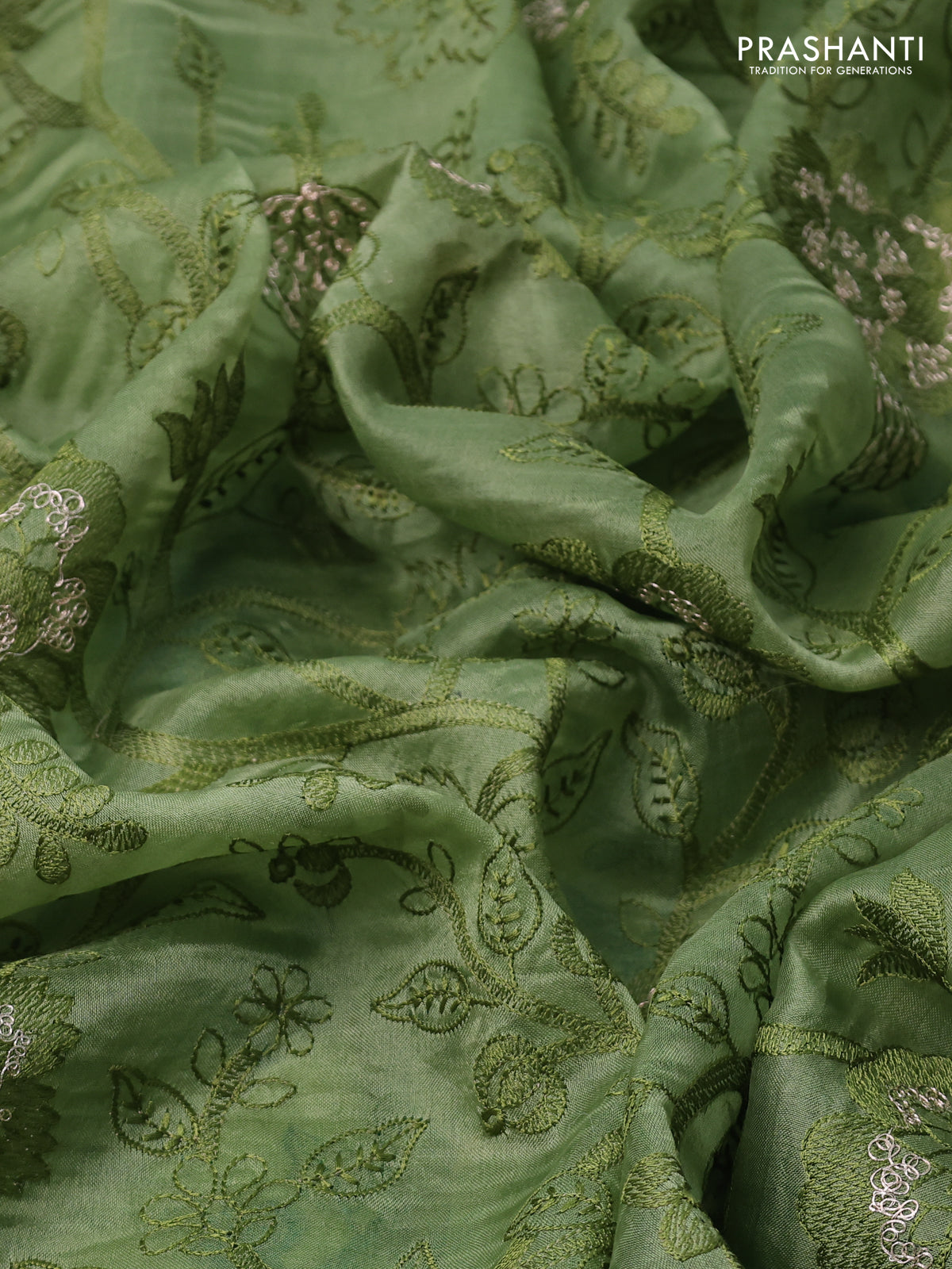 Pure organza silk saree pastel green with allover floral embroidery and zari woven border