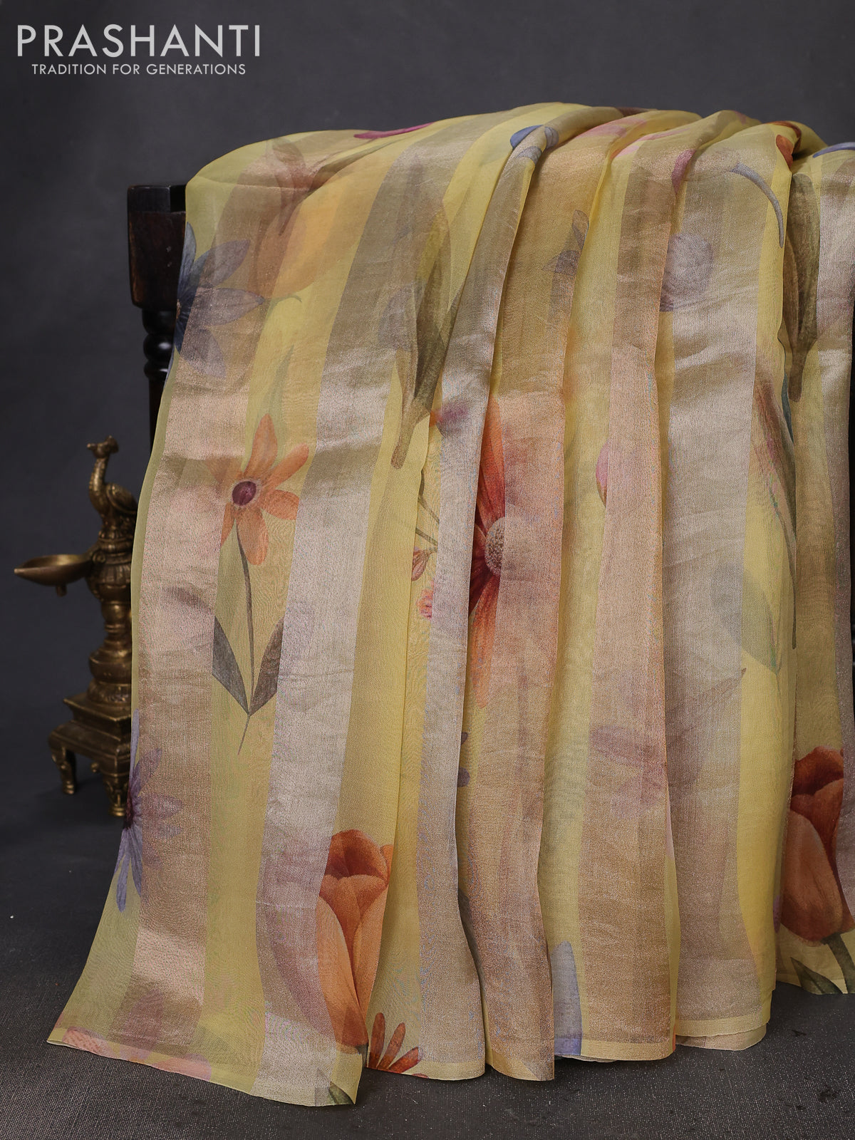 Pure organza silk saree yellow shade with allover floral digital prints & zari stripe pattern in borderless style