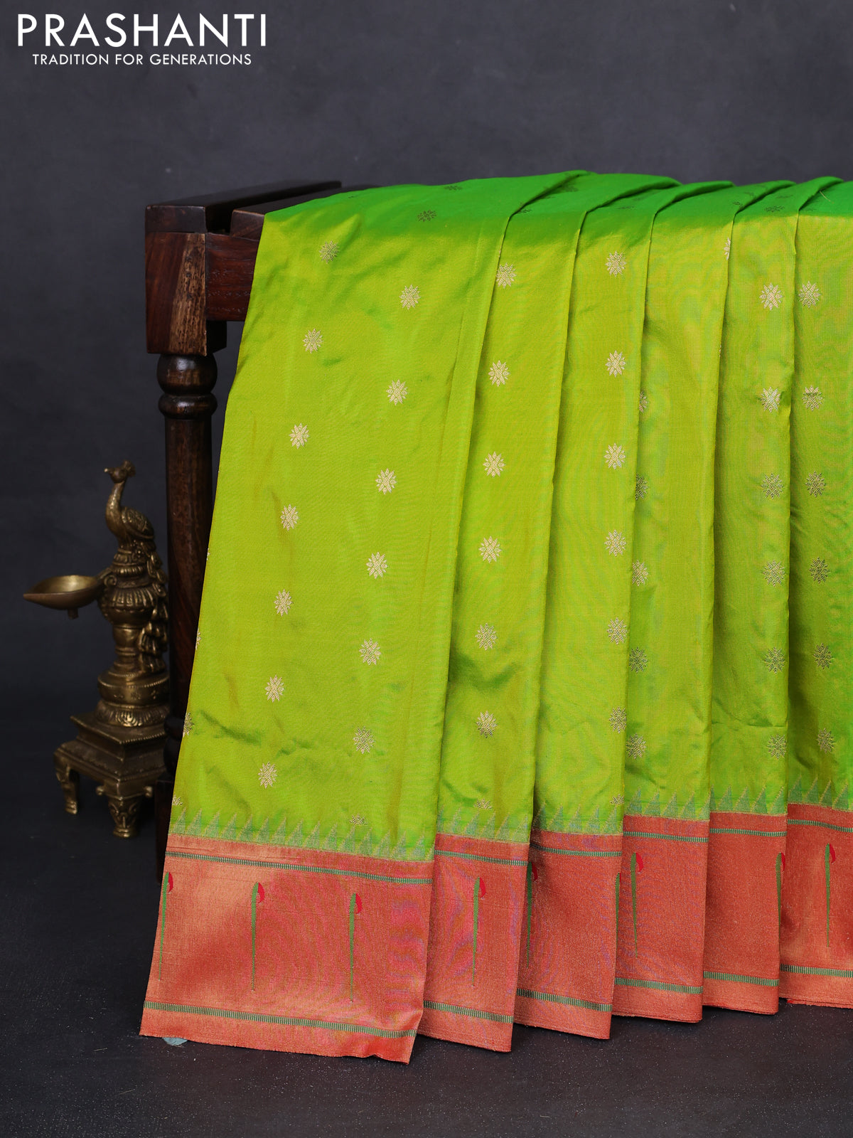 Pure paithani silk saree fluorescent green and red with zari woven buttas and muniya butta border