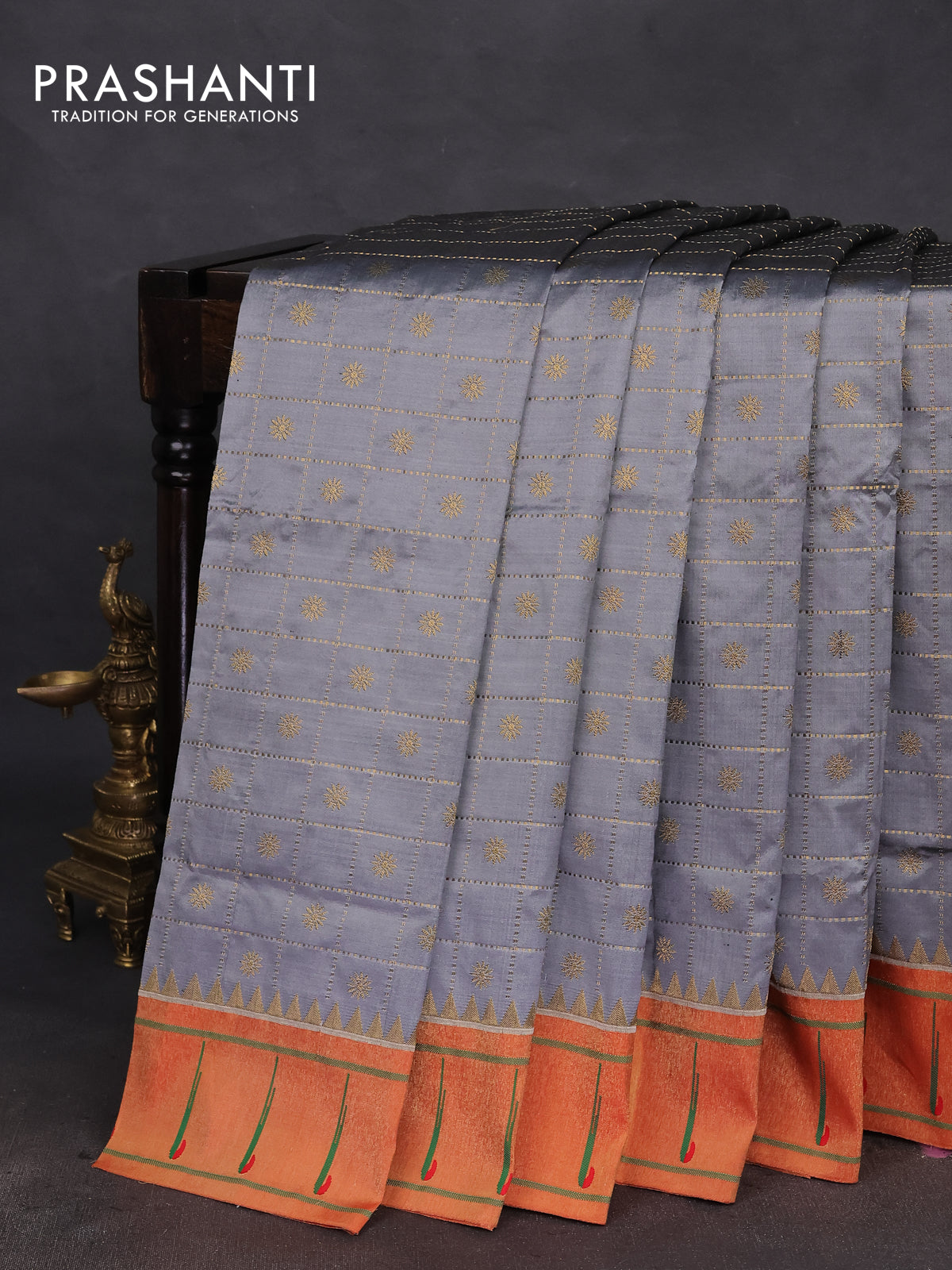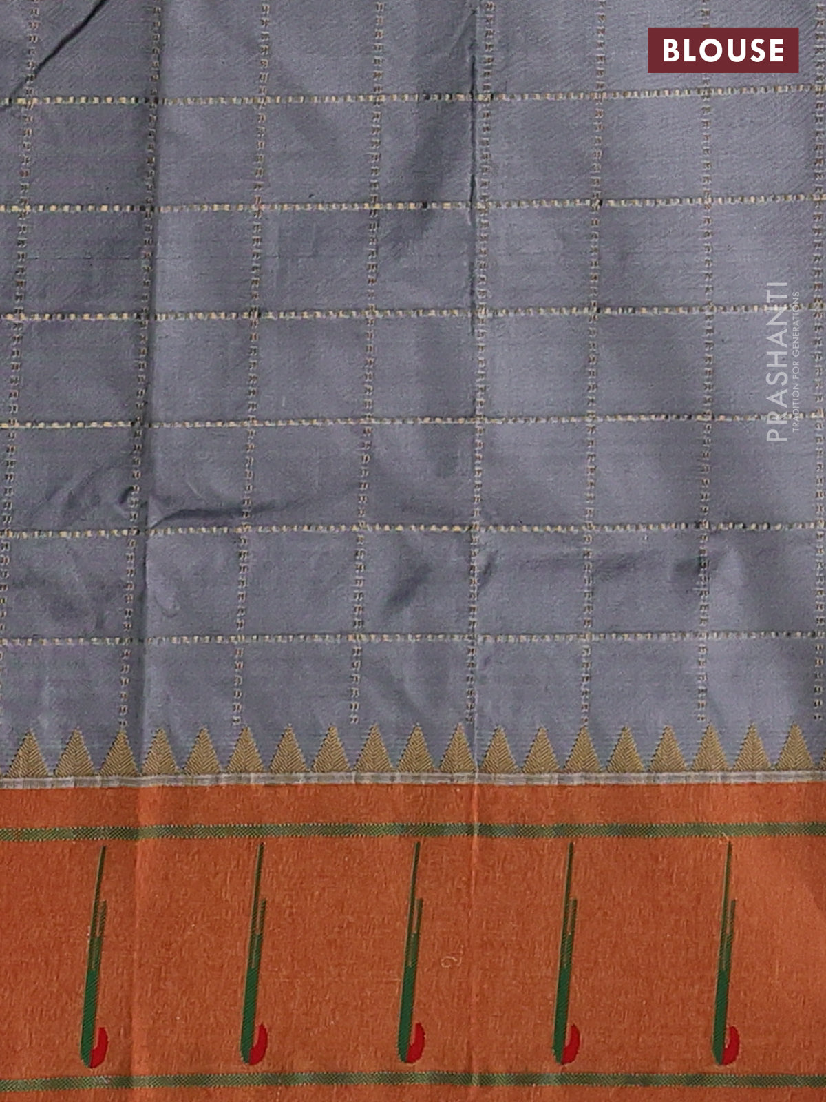 Pure paithani silk saree grey and red with allover zari checks & buttas and zari woven muniya butta border