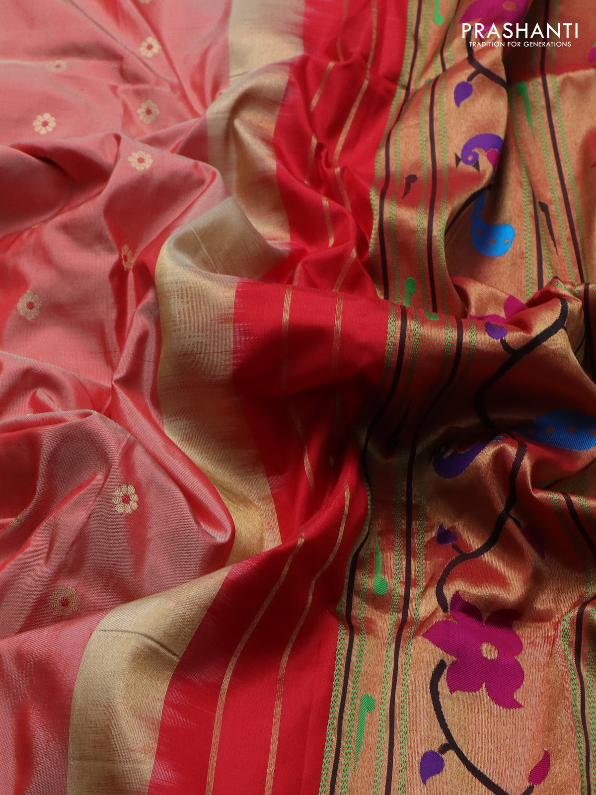 Pure paithani silk saree red shade with zari woven buttas and zari woven korvai border