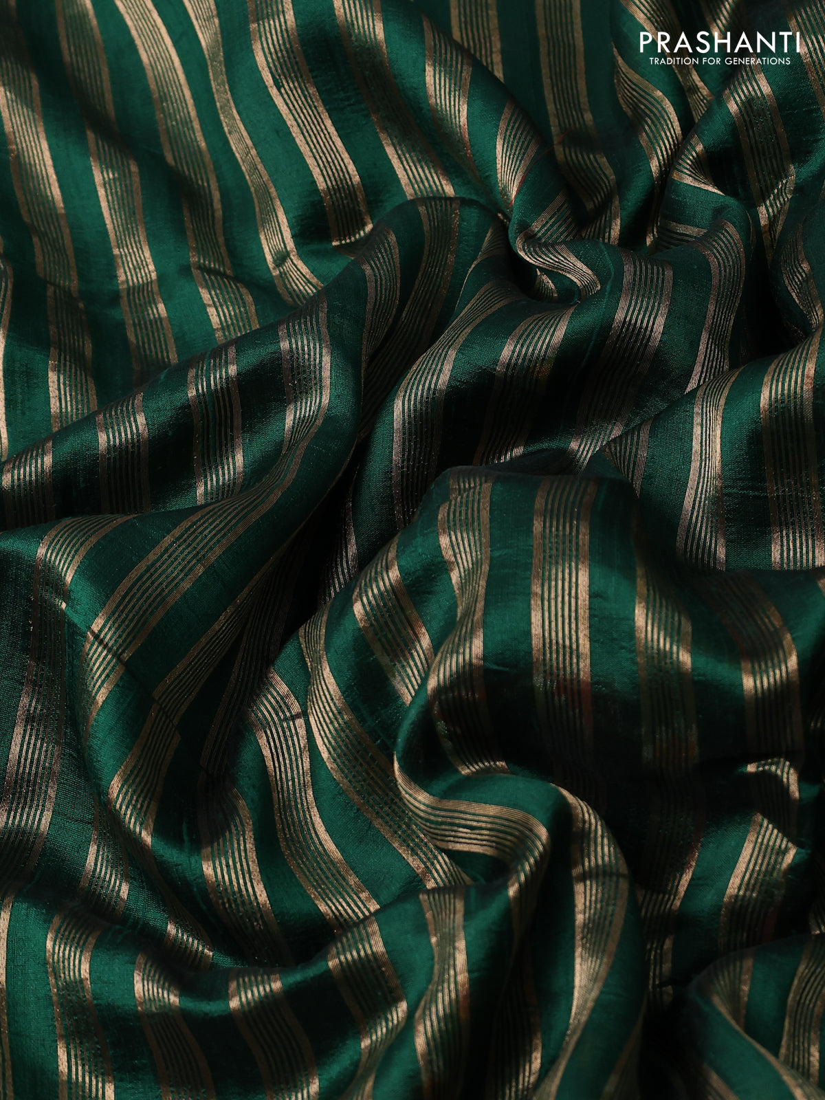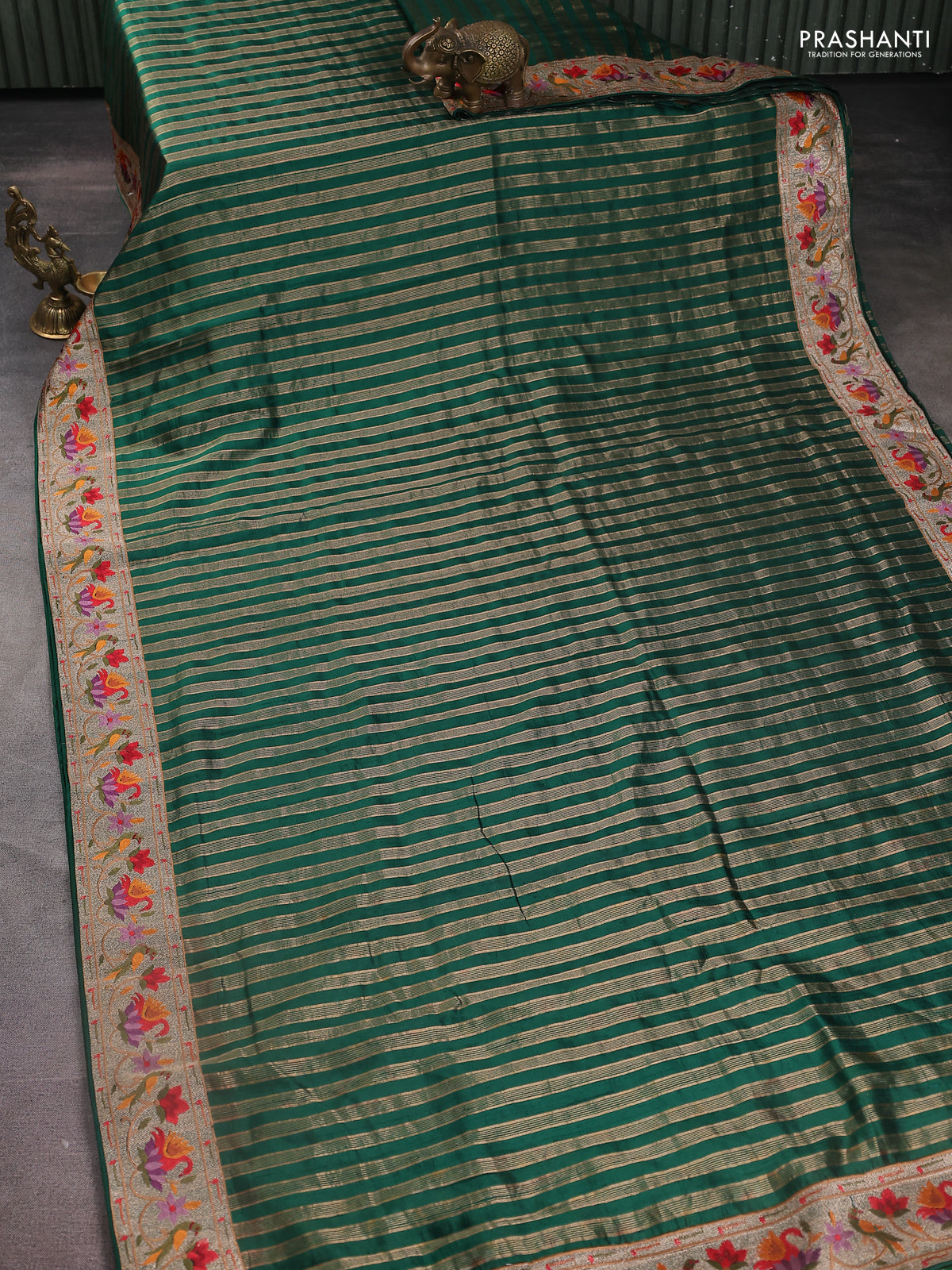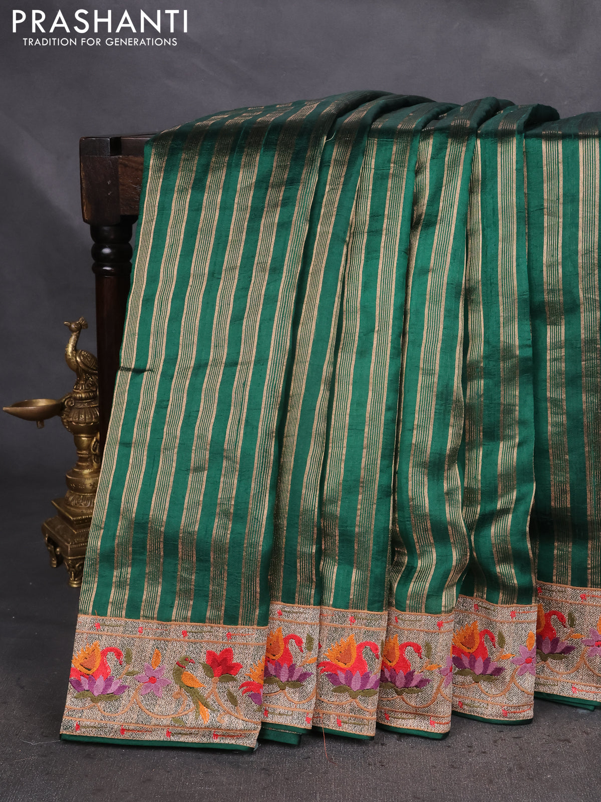 Pure raw silk saree green with allover zari woven stripe pattern and embroidery pallu & border