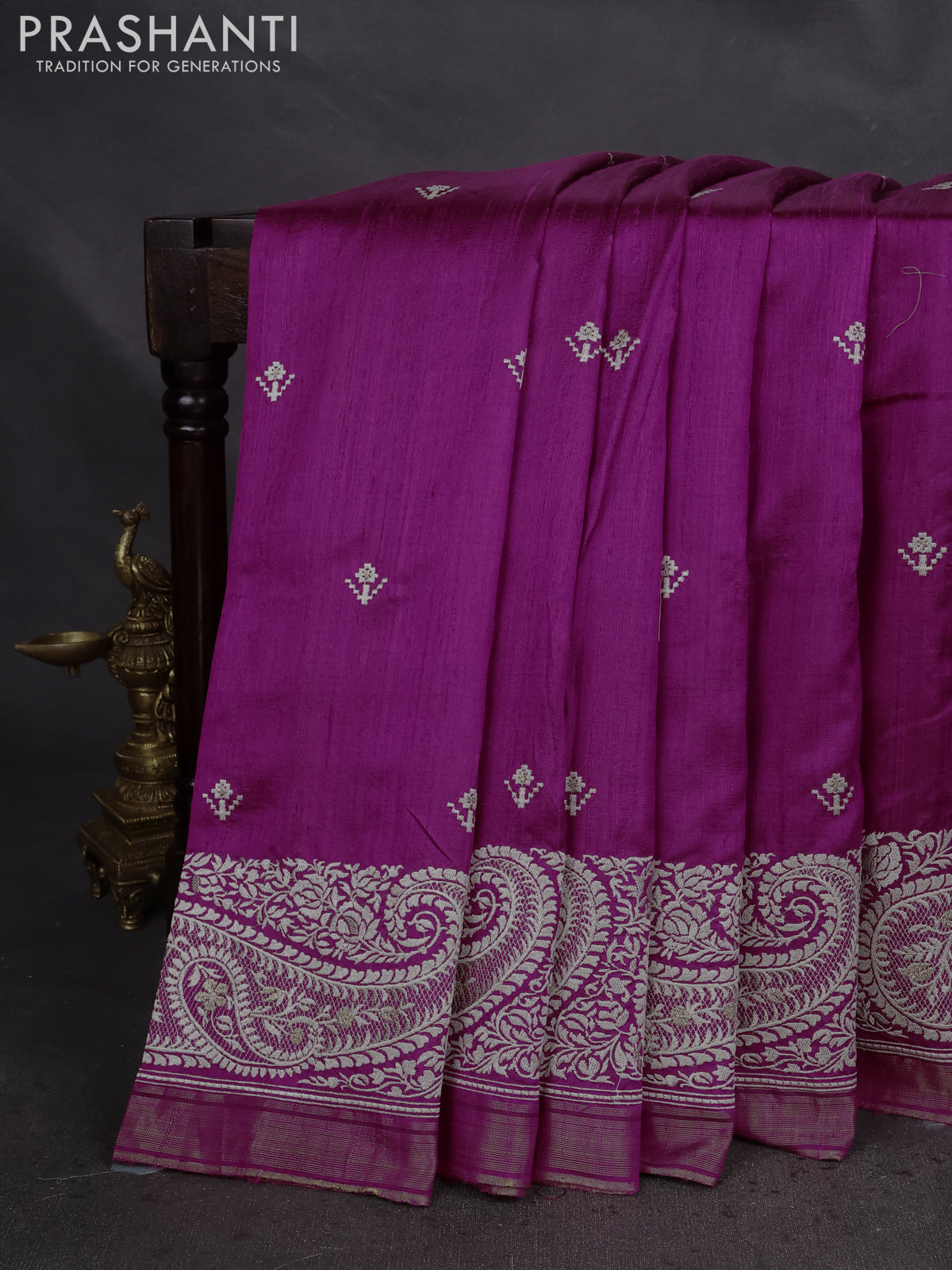 Pure raw silk saree magenta pink with embroidery buttas and paisley embroidery border