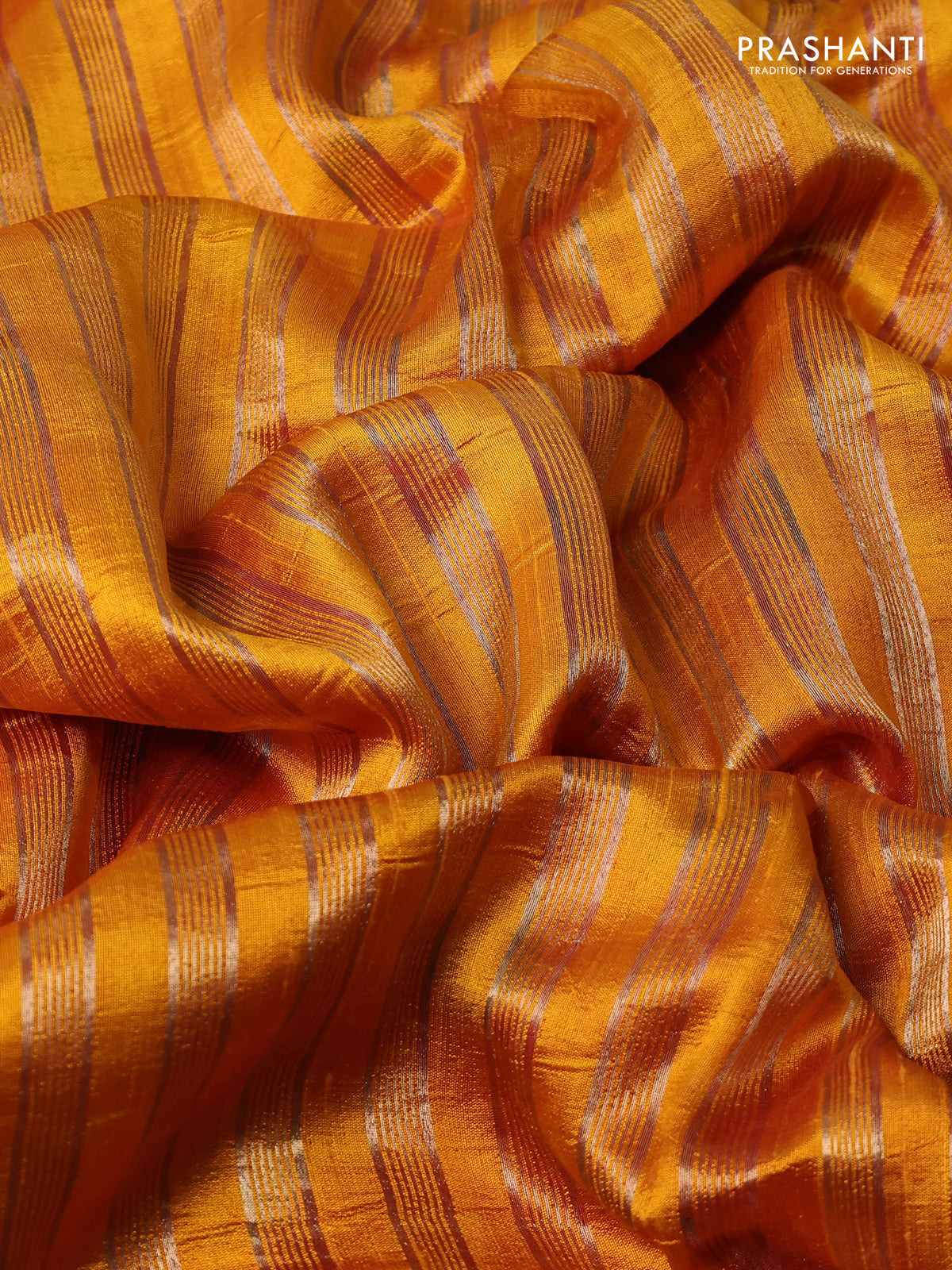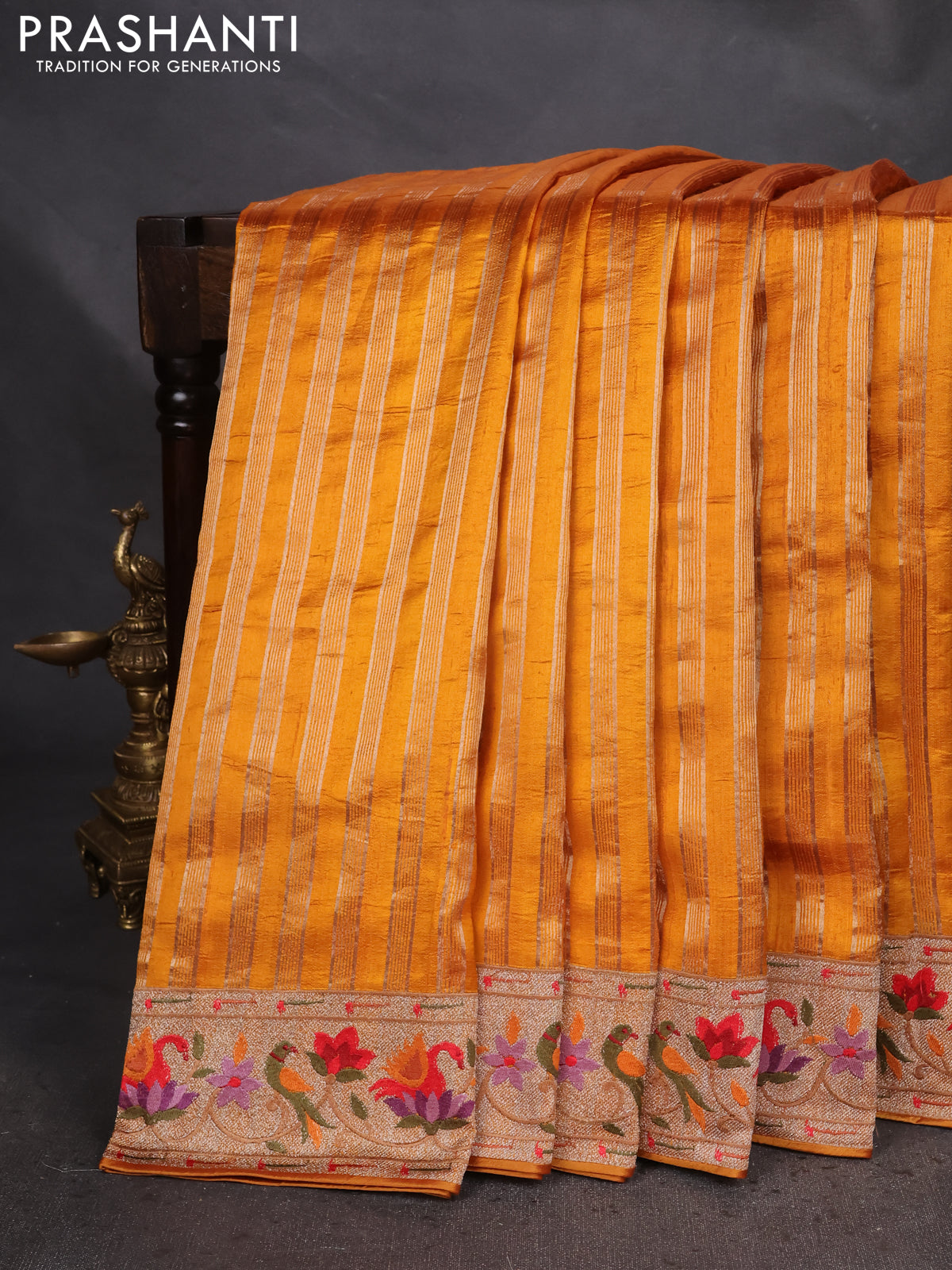 Pure raw silk saree mustard yellow with allover zari woven stripe pattern and embroidery pallu & border