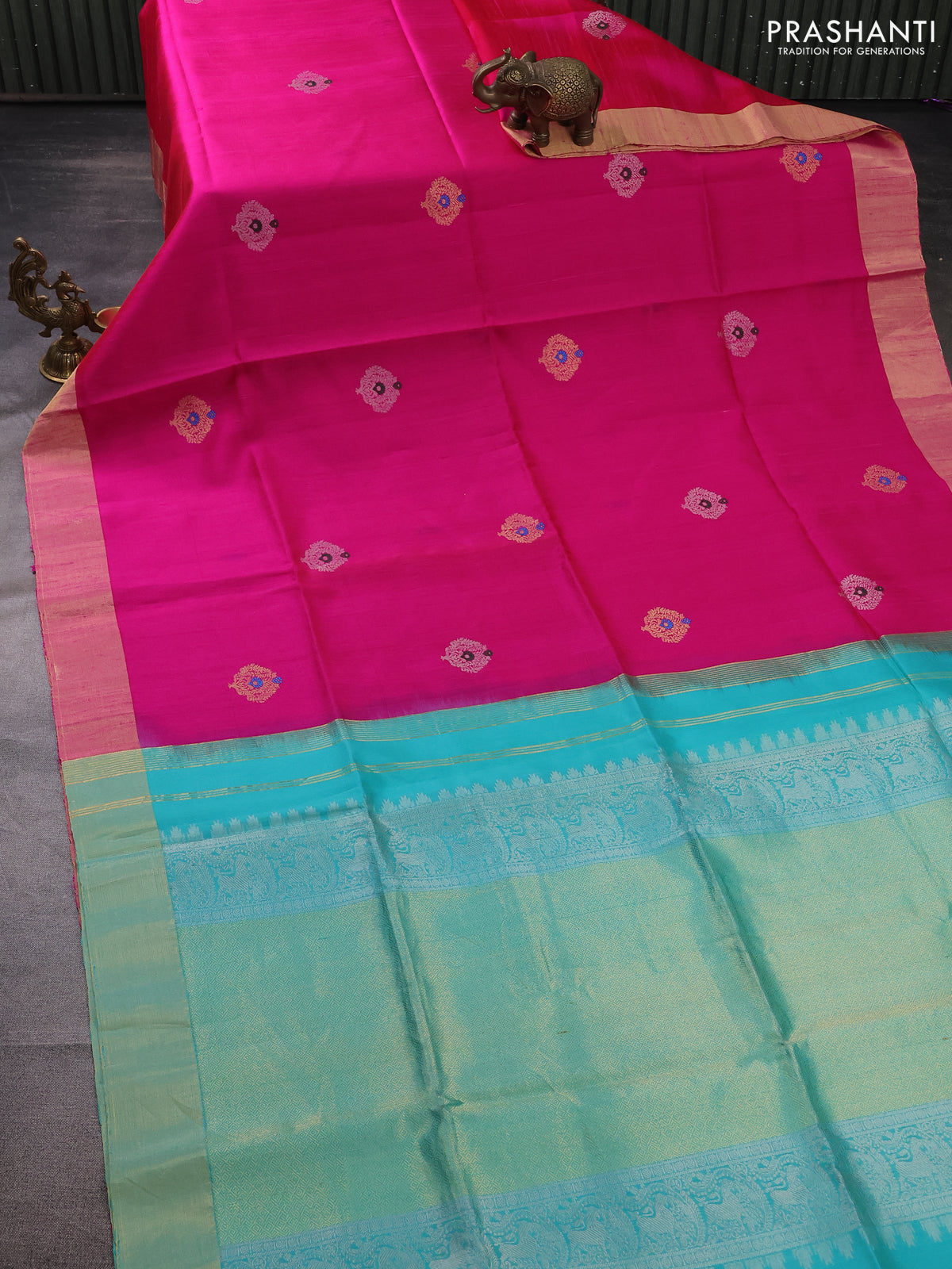 Pure raw silk saree pink and teal green with silver & gold zari woven buttas and zari woven border