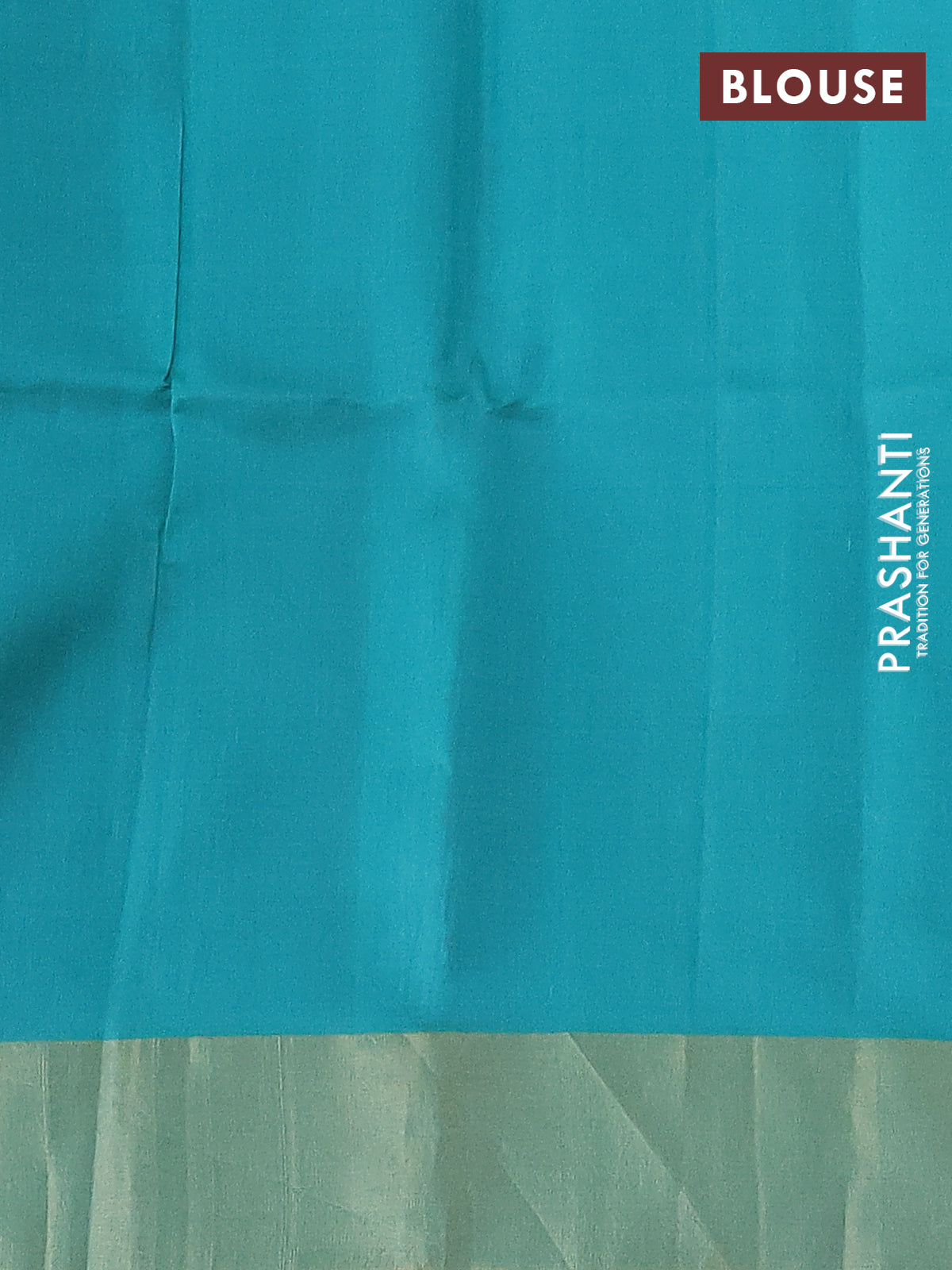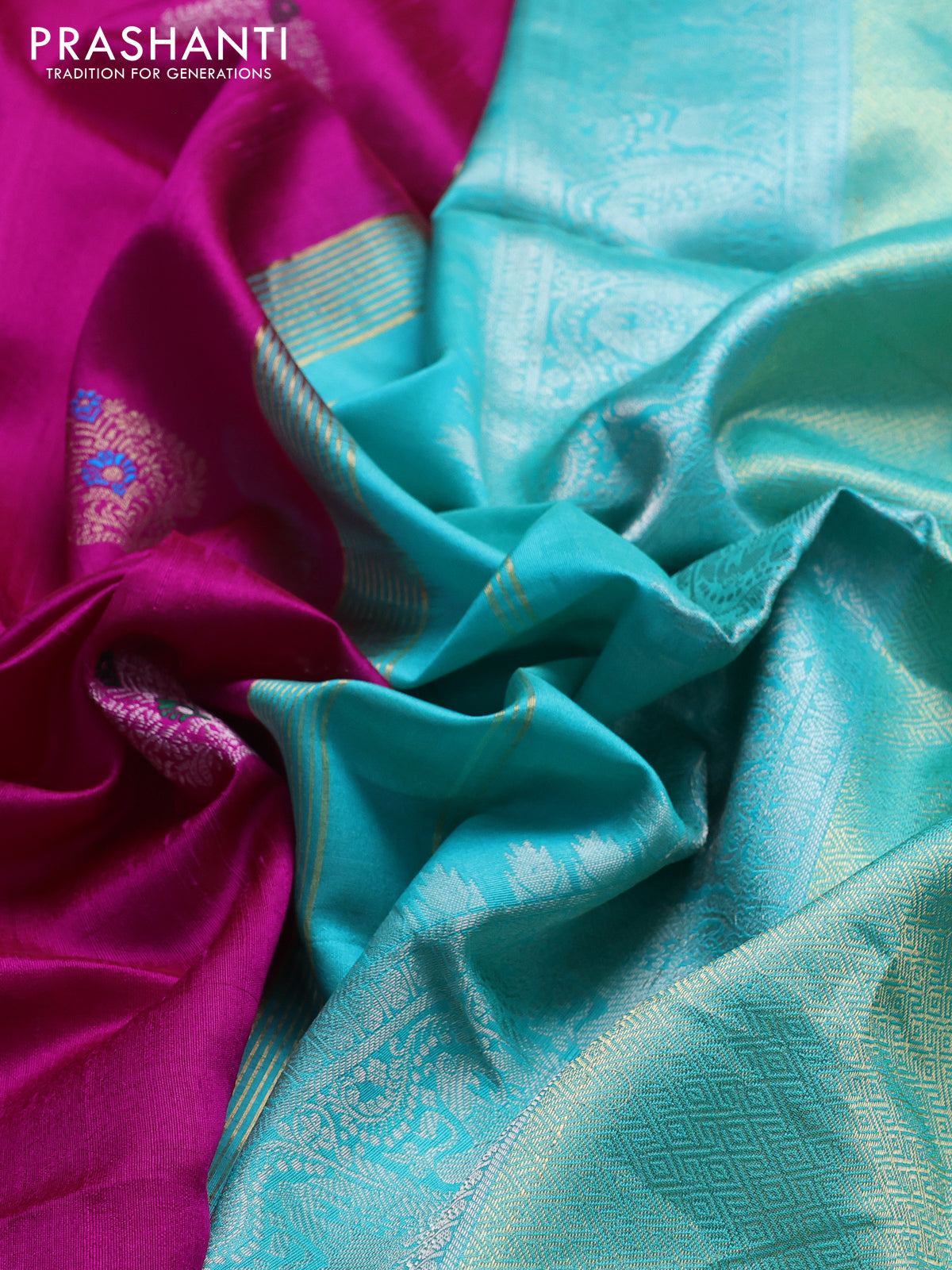 Pure raw silk saree pink and teal green with silver & gold zari woven buttas and zari woven border