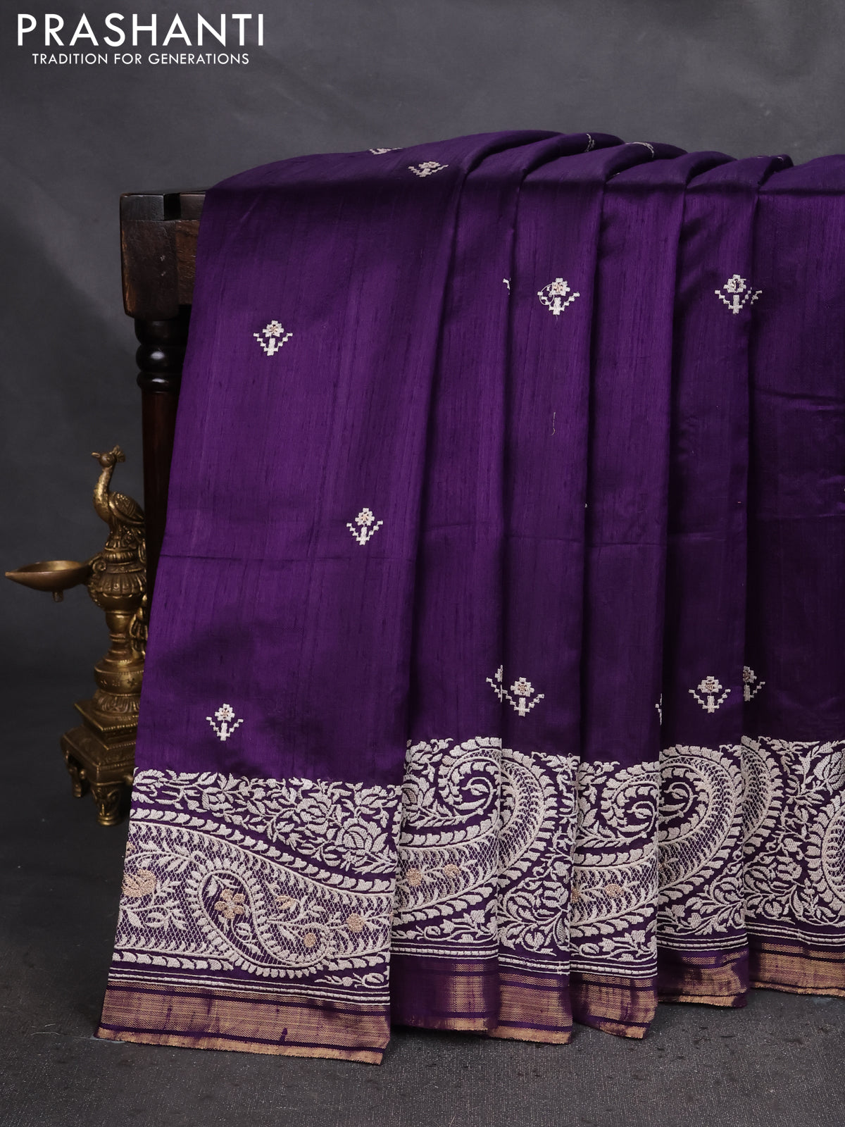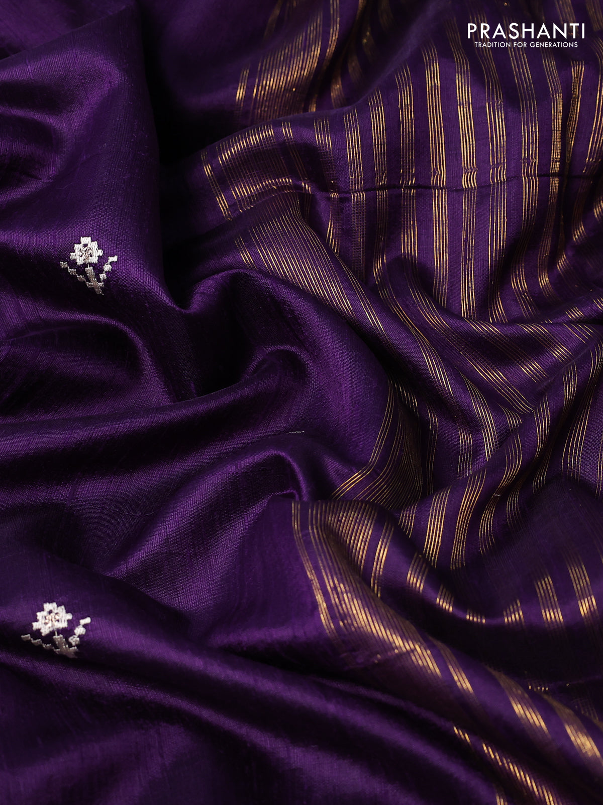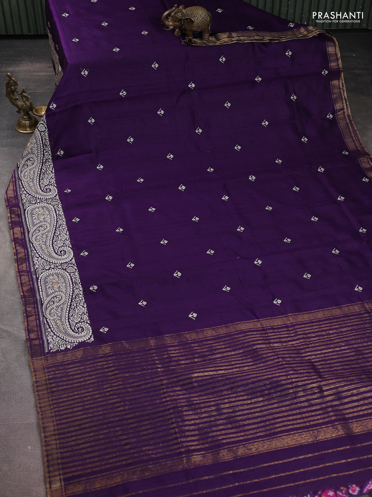 Pure raw silk saree violet with embroidery buttas and paisley embroidery border