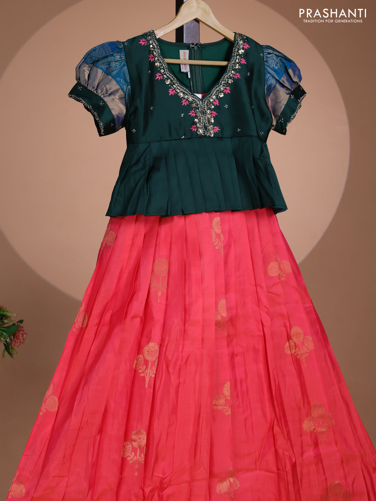 Pure silk kids lehenga dark green and peach pink with embroidery beads work neck pattern & puff sleeve and zari woven border for 11 years