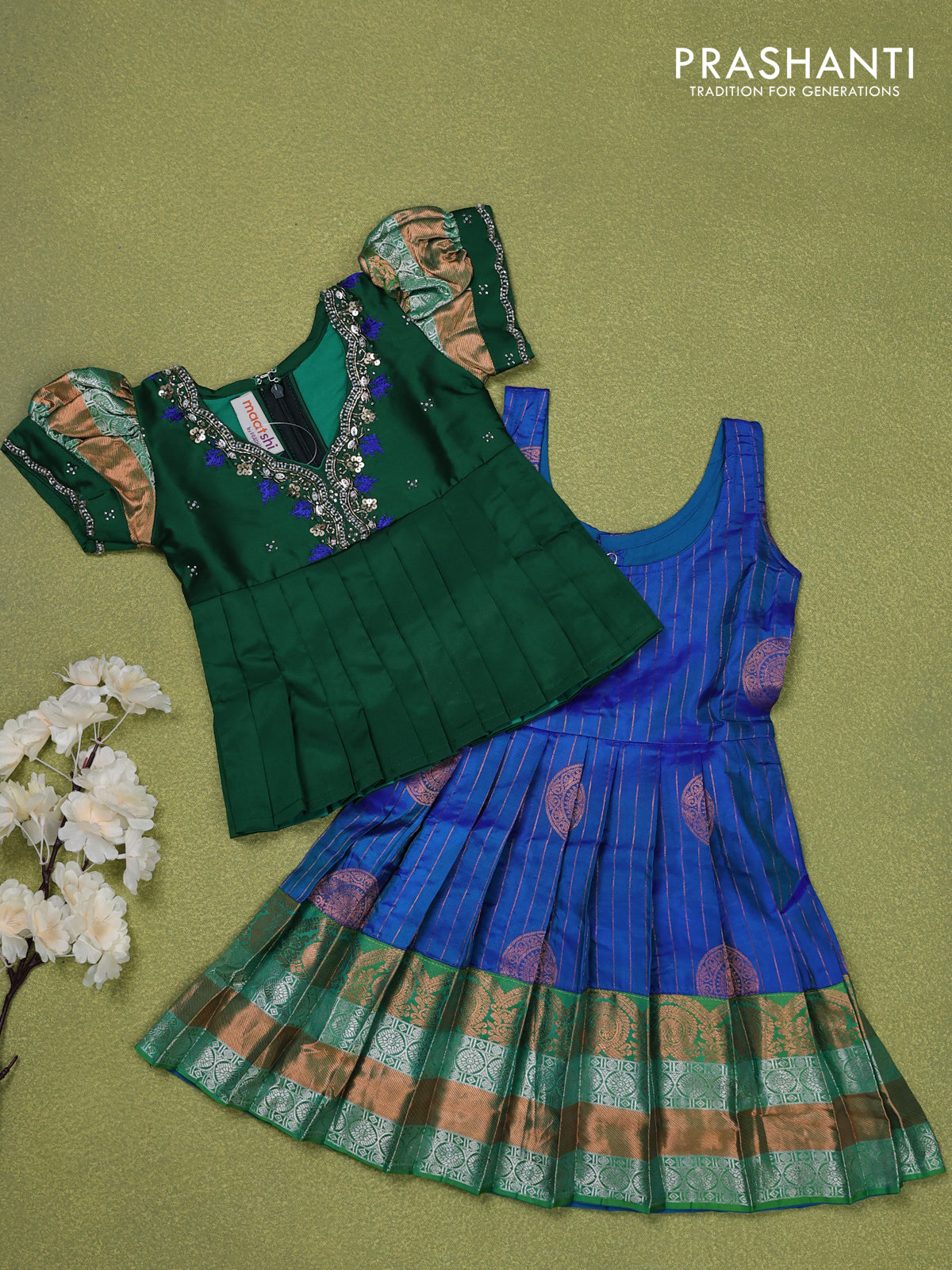 Pure silk kids lehenga green and dual shade of blue with embroidery beads work neck pattern & puff sleeve and zari woven border for 0-6 months