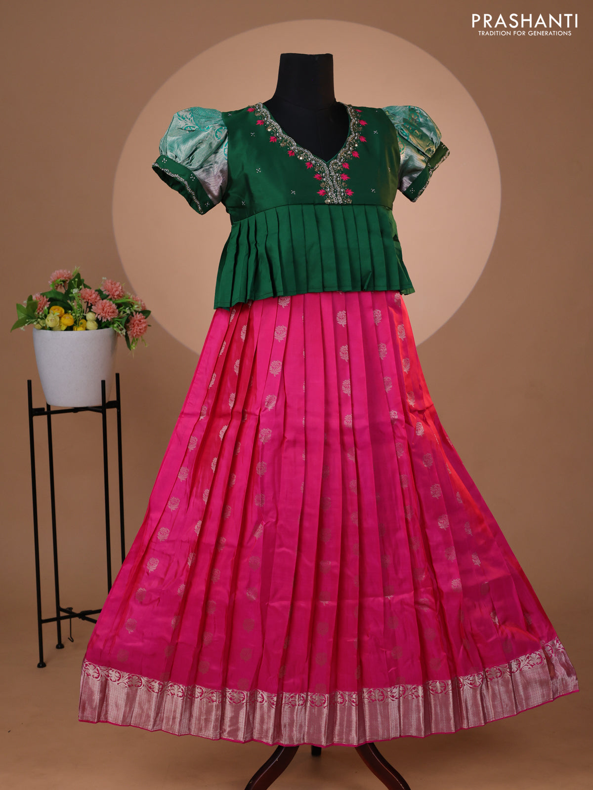 Pure silk kids lehenga green and pink with embroidery beads work neck pattern & puff sleeve and silver zari woven border for 12 years