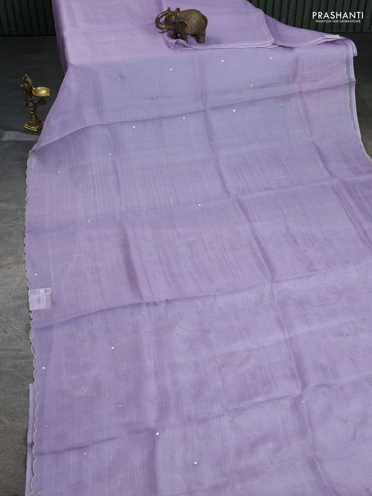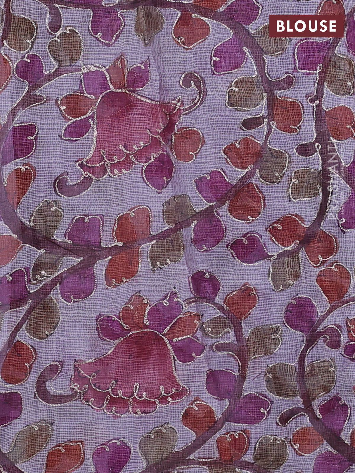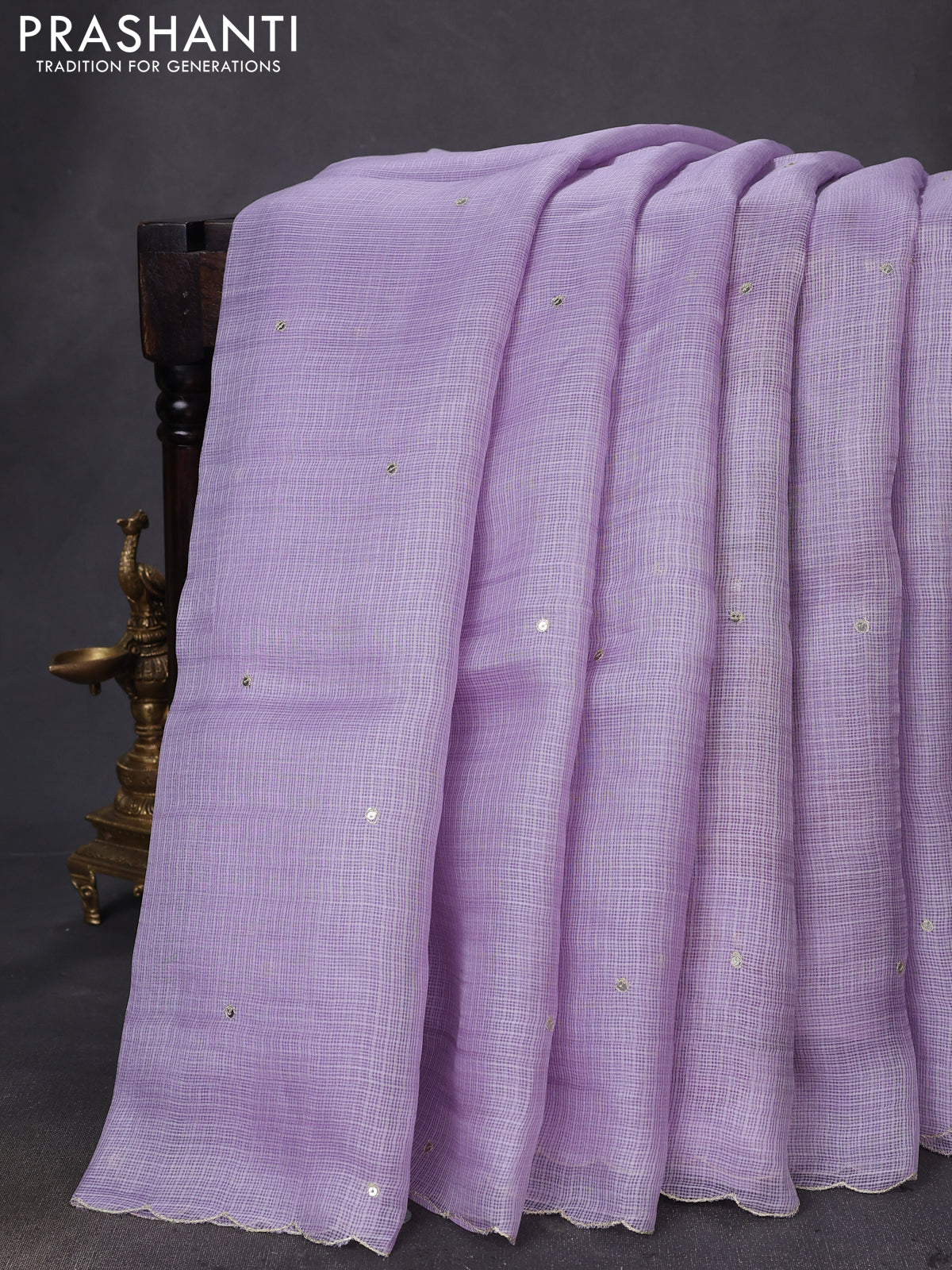 Pure silk kota saree lavender with sequin buttas and scallop design border and kalamkari prints pita work blouse