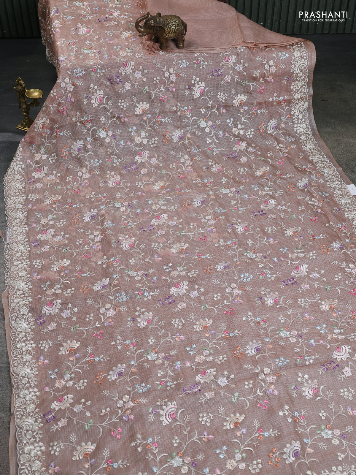 Pure silk kota saree pastel brown with allover parsi work and embroidery scallop border