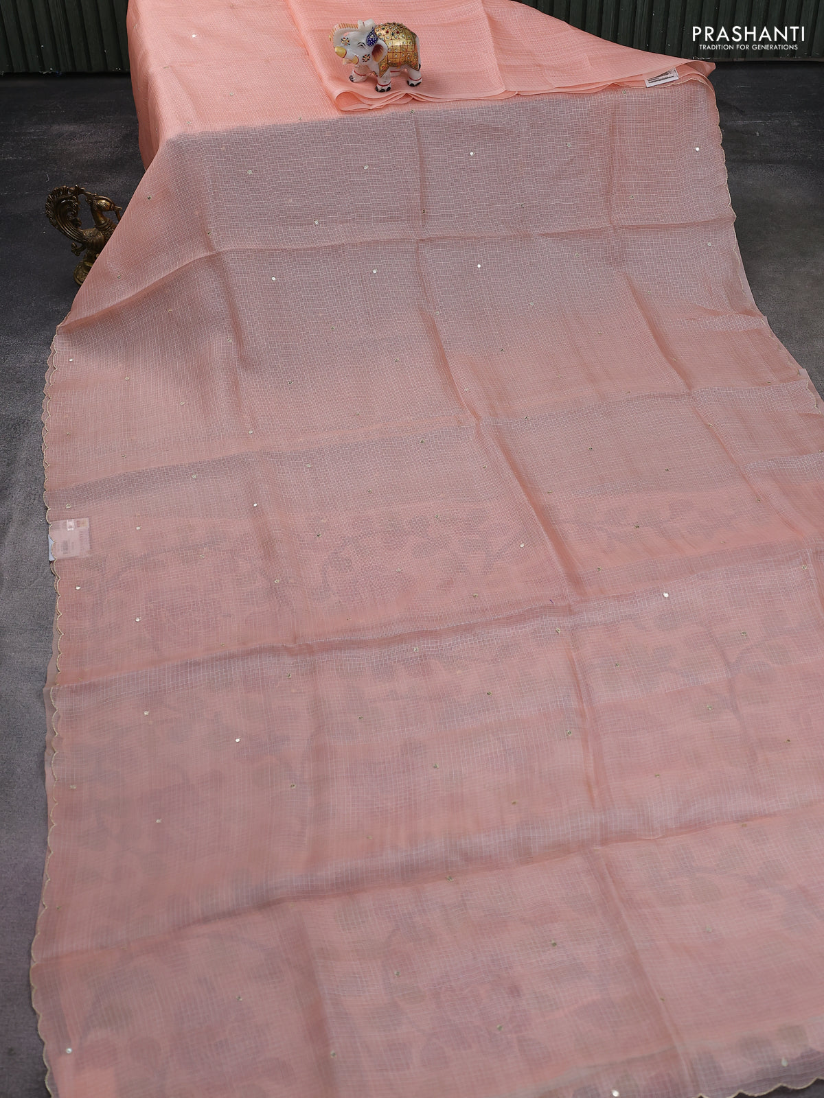 Pure silk kota saree peach orange with sequin buttas and scallop design border Kalamkari prints pita work blouse