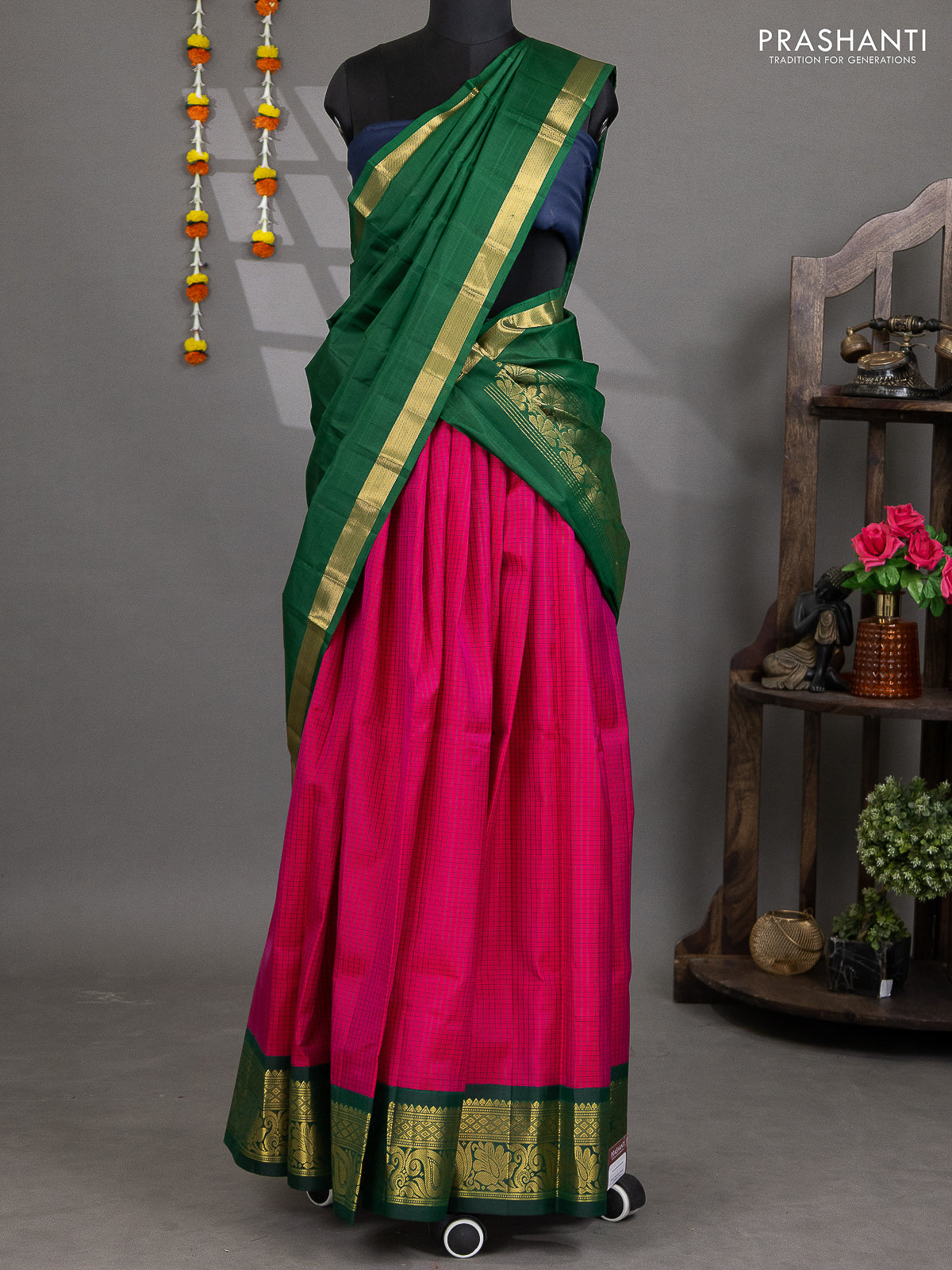 Pure silk lehenga dhawani dark pink and green with allover checked pattern and rich zari woven korvai border