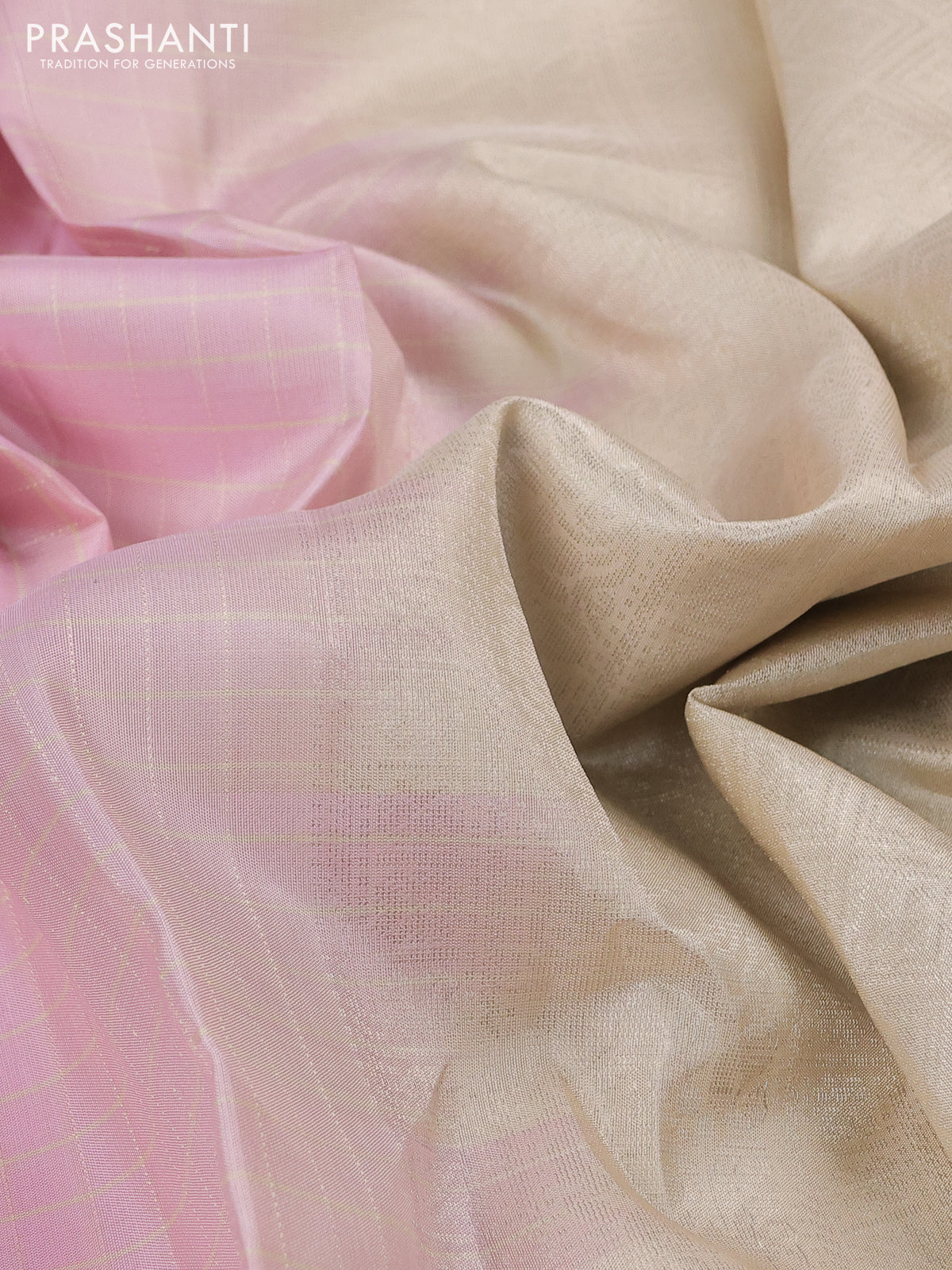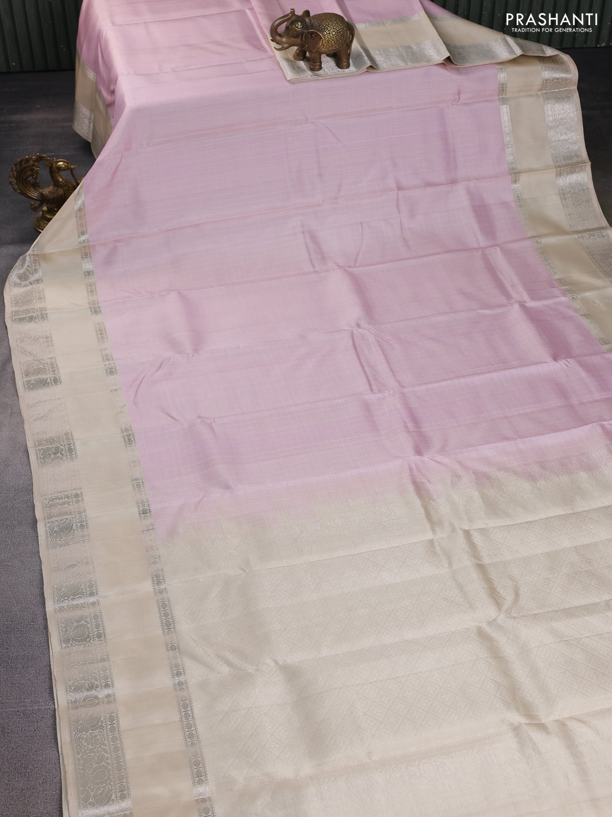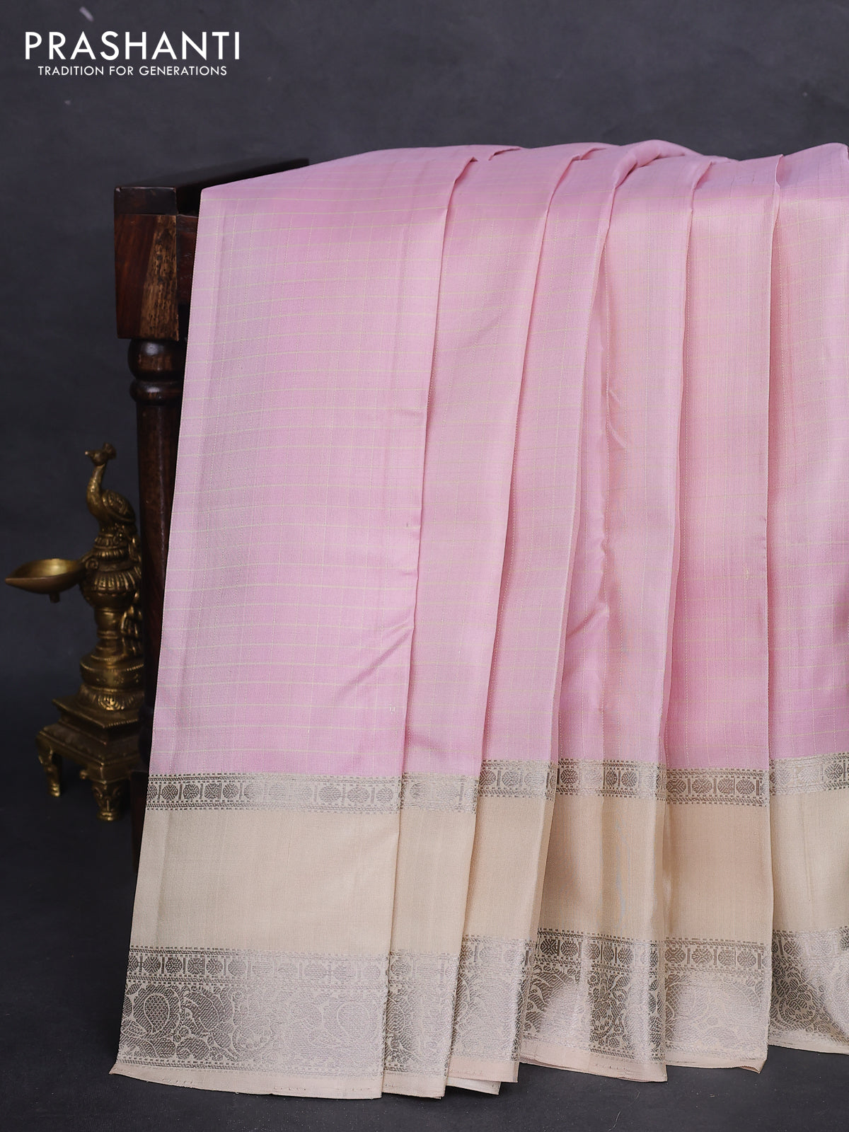 Pure soft silk saree baby pink and cream with allover checked pattern and rettapet silver zari woven border