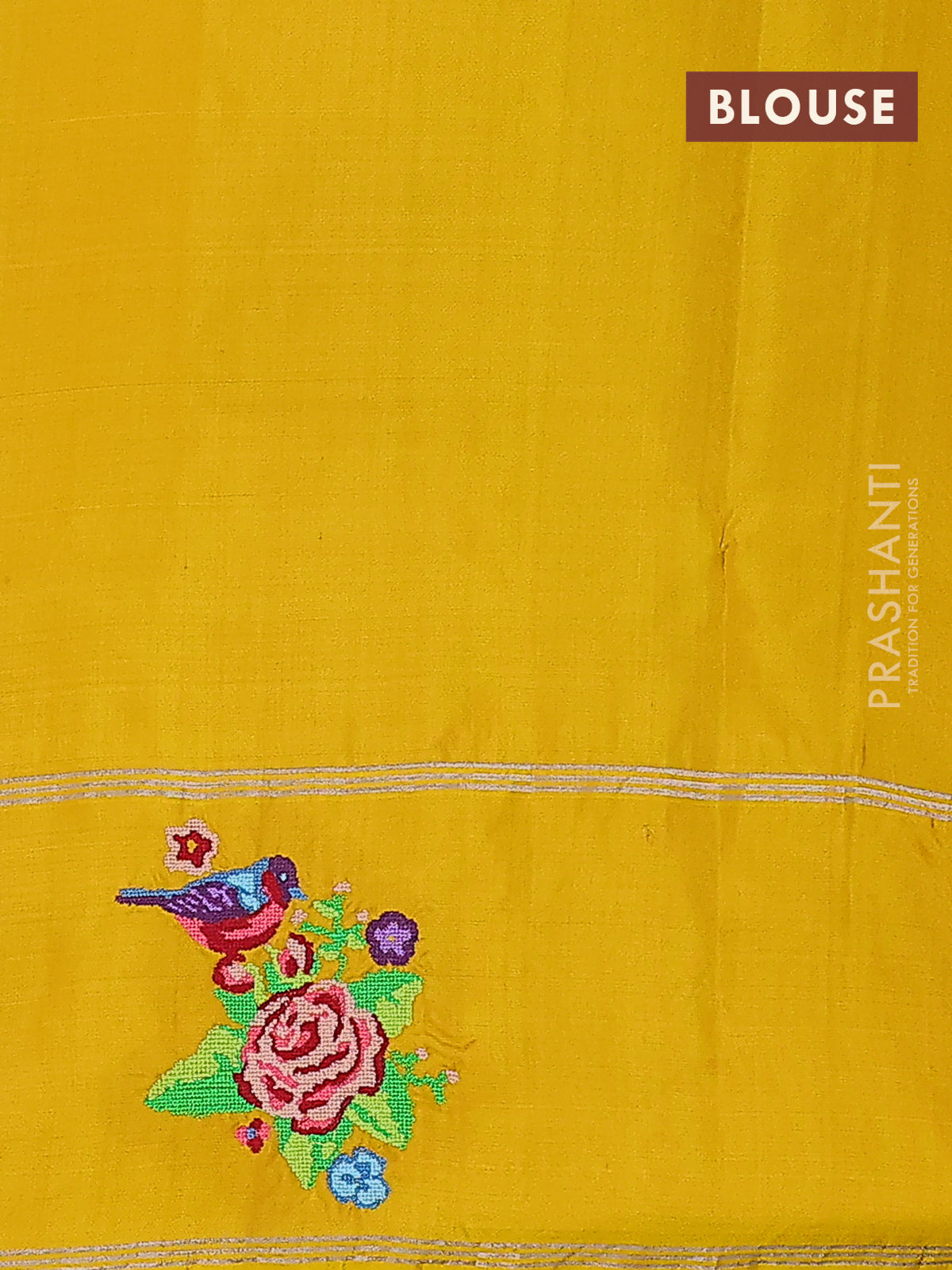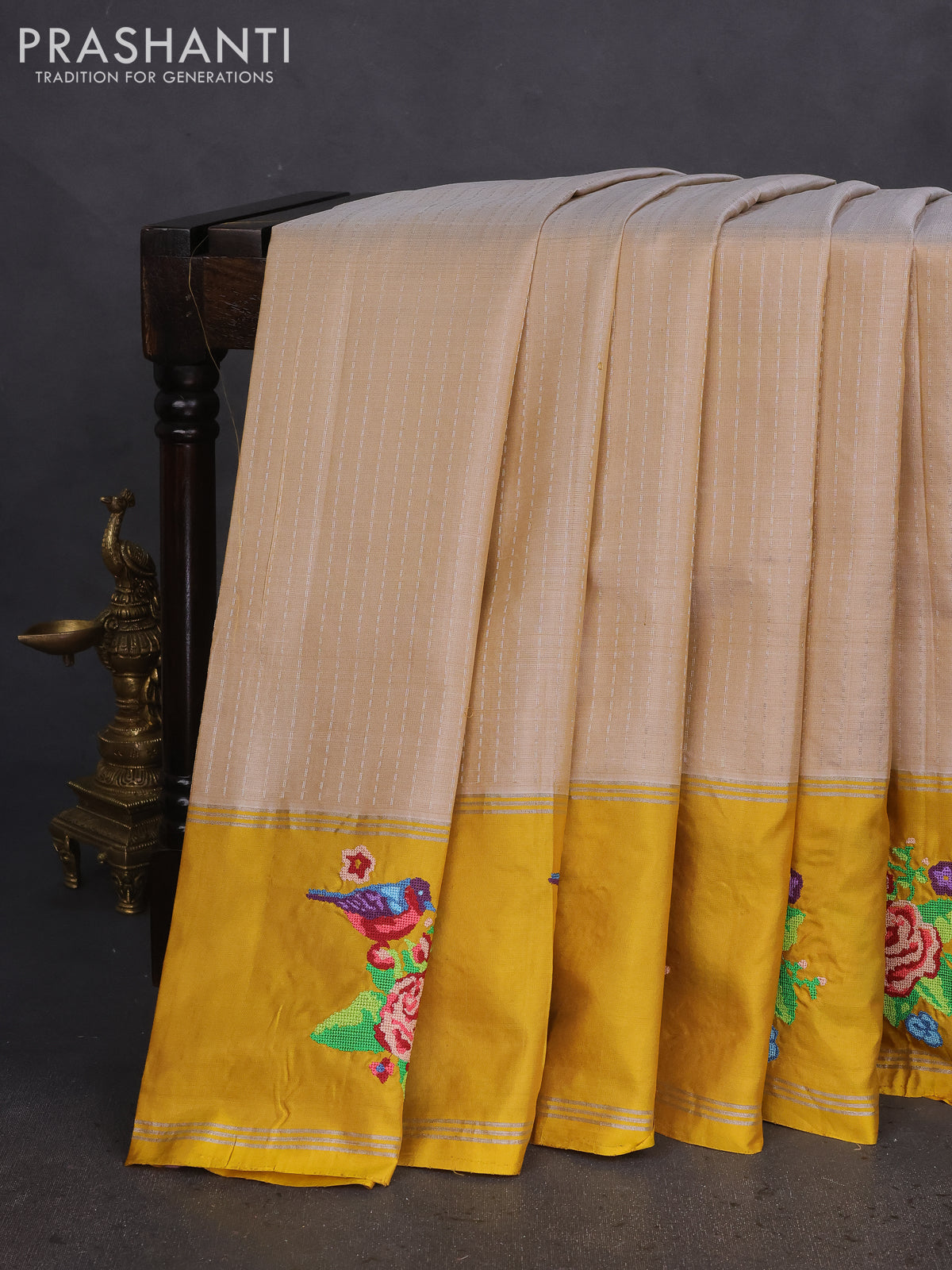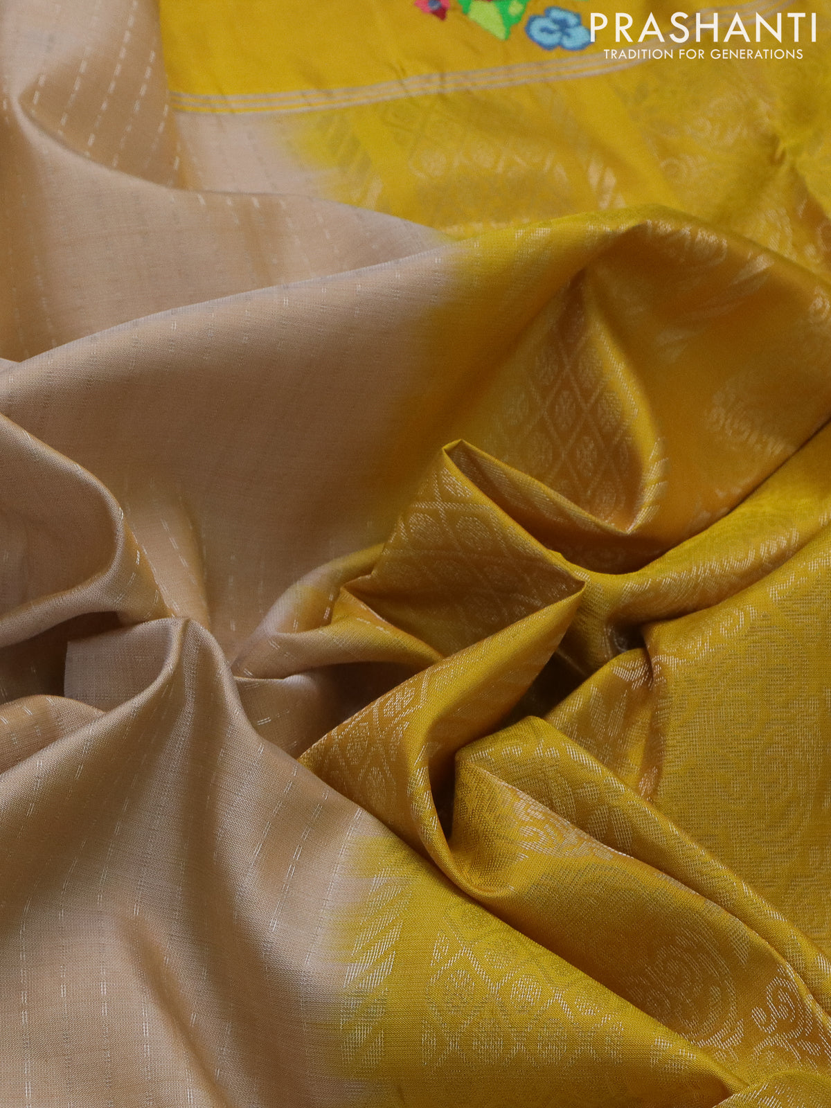 Pure soft silk saree beige and yellow with allover silver zari weaves and silver zari woven embroidery butta border