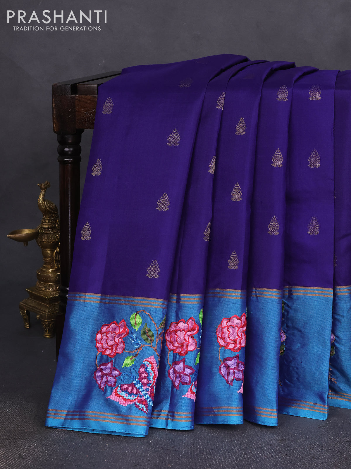Pure soft silk saree blue and dual shade of blue with zari woven floral buttas and zari woven embroidery butta border