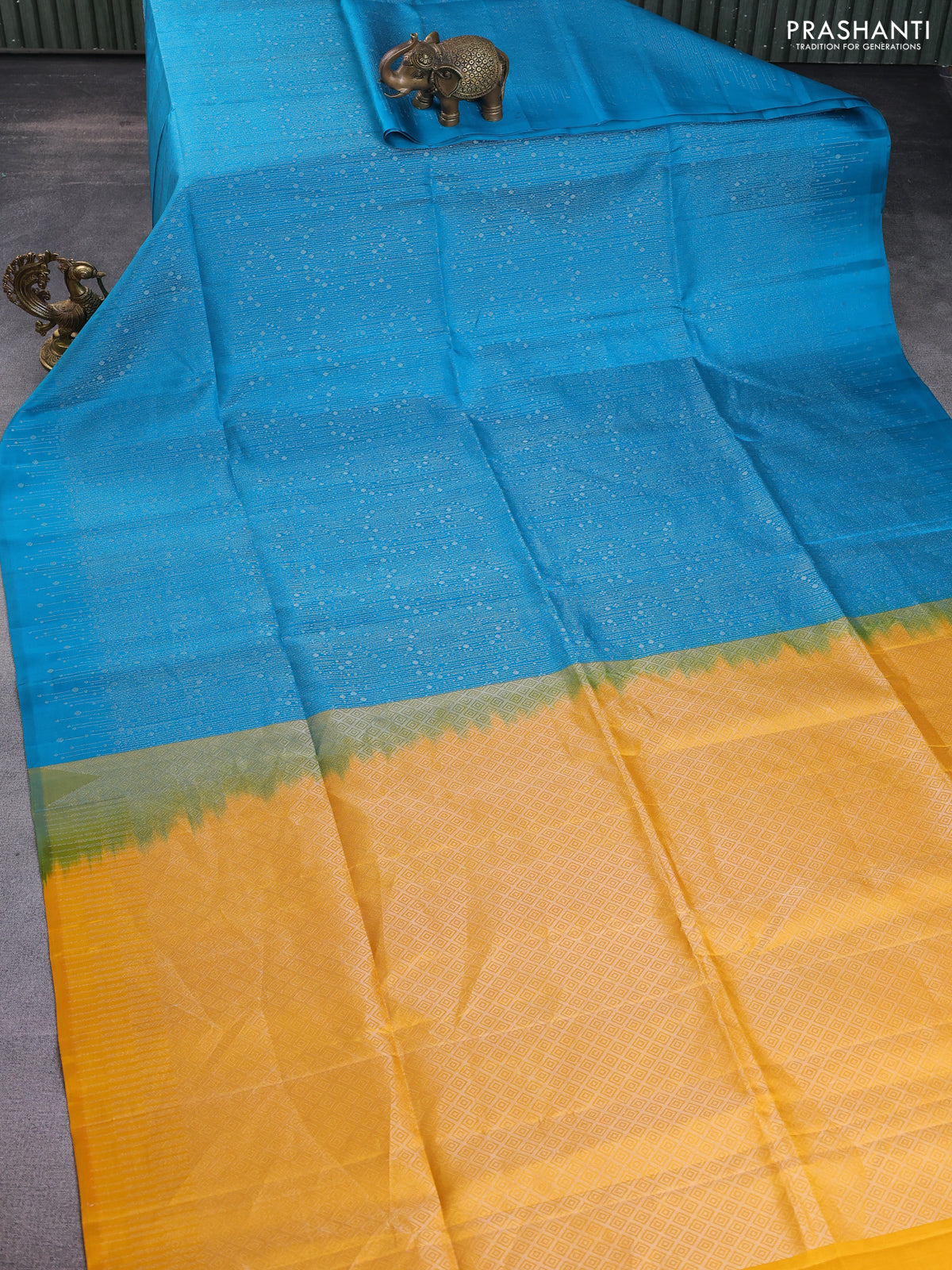 Pure soft silk saree cs blue and mustard yellow with allover silver zari woven brocade weaves in borderless style