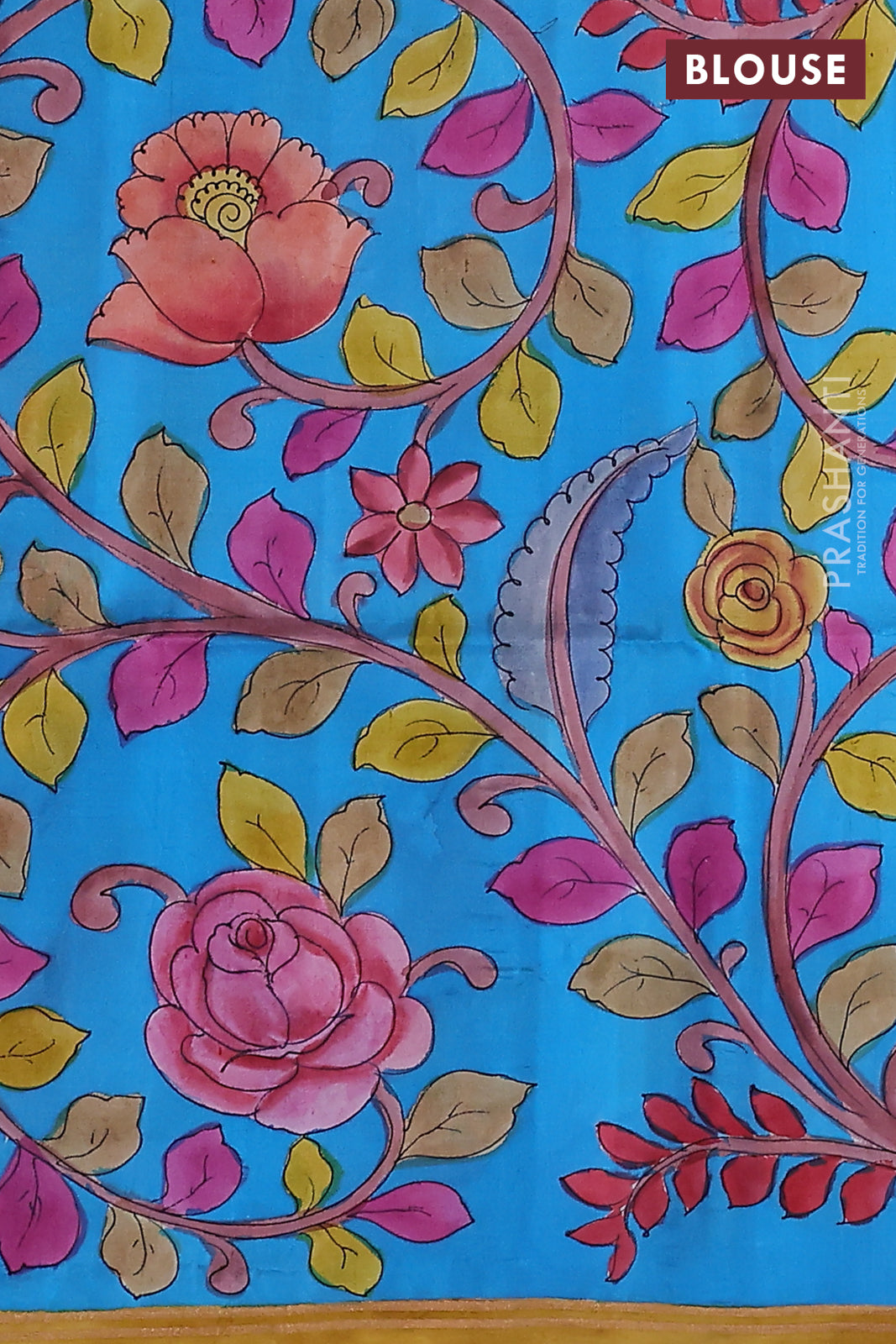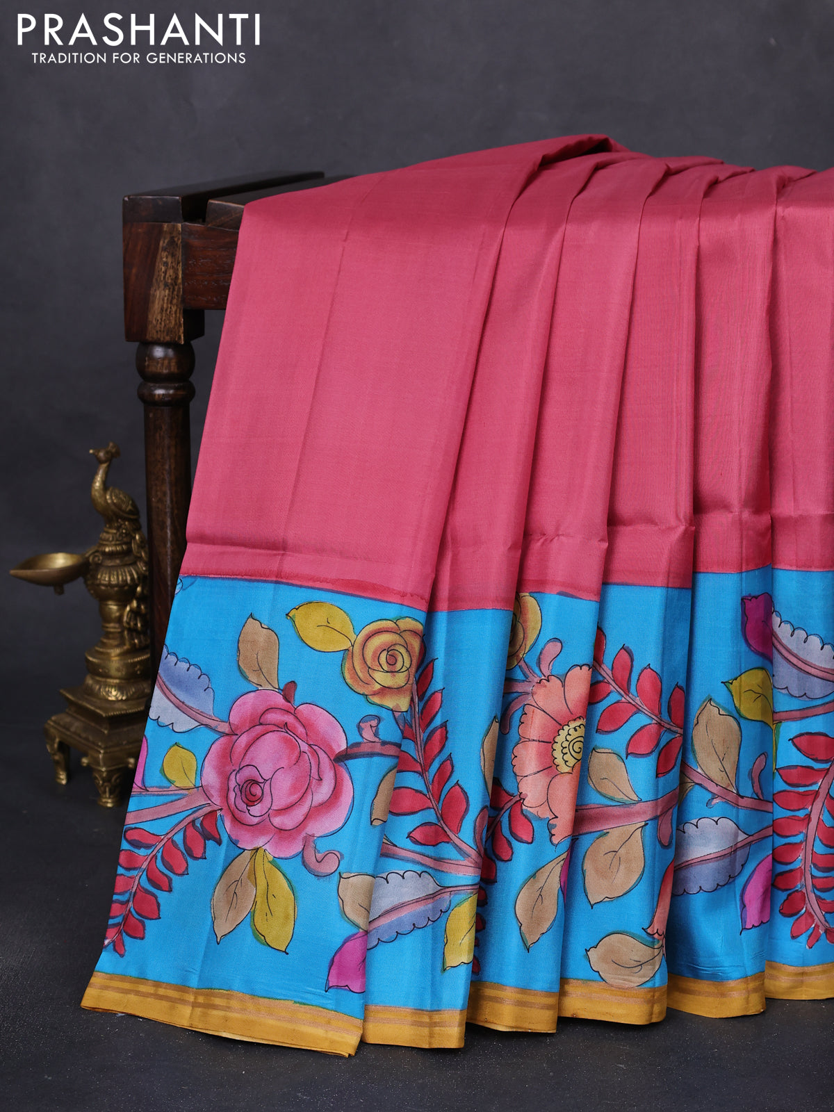Pure soft silk saree dark peach and cs blue with plain body and kalamkari hand painted border & pallu