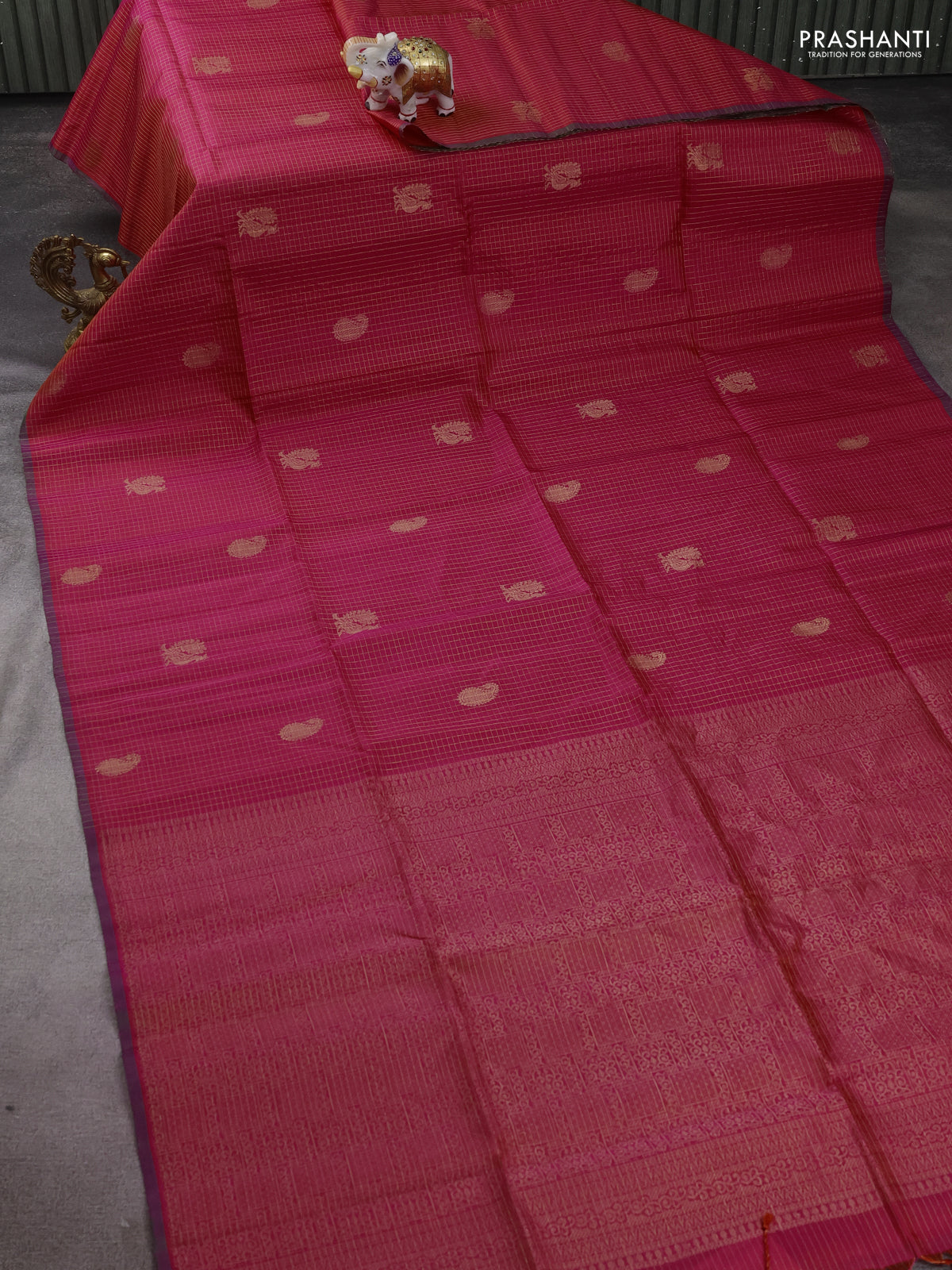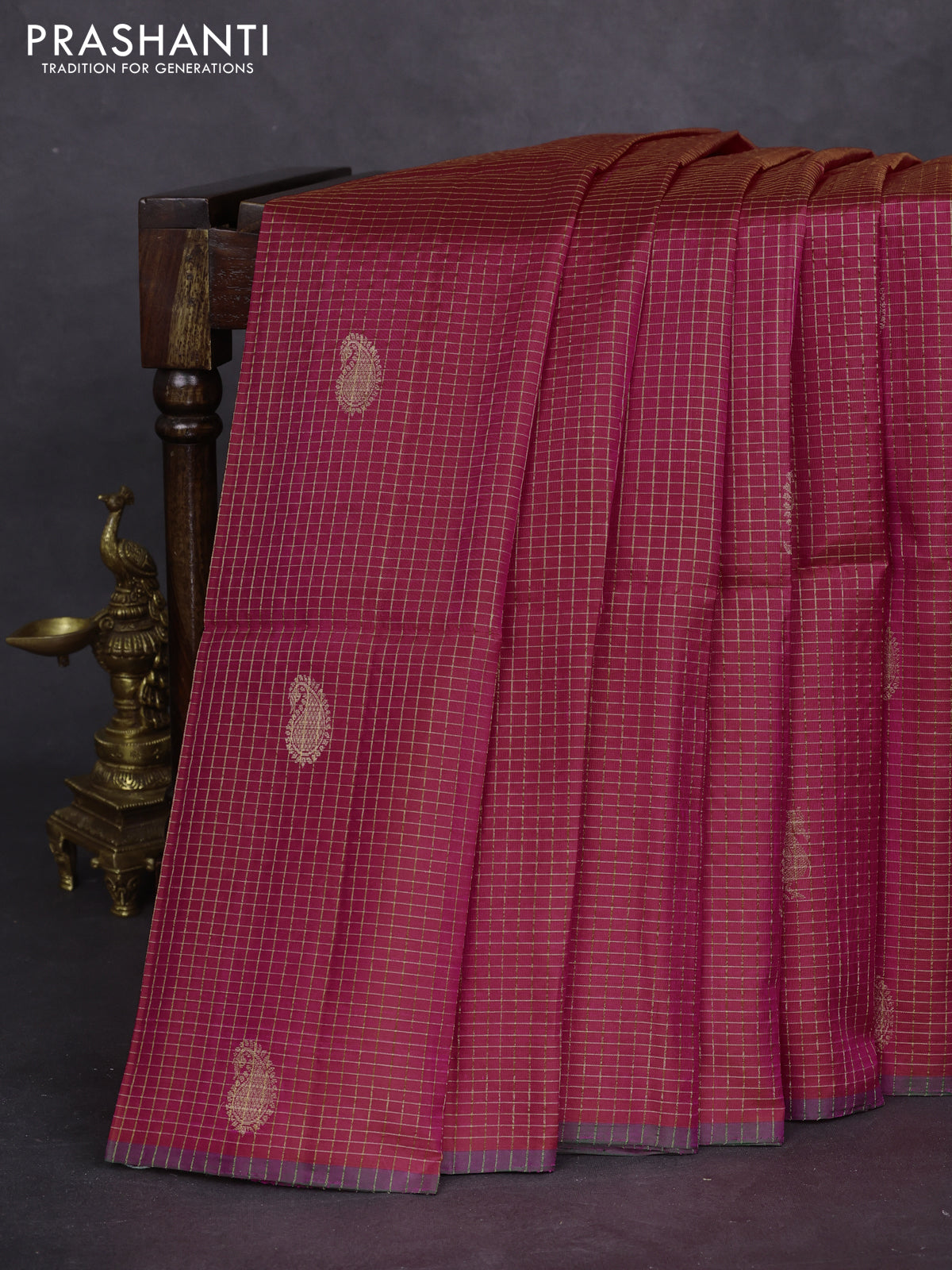 Pure soft silk saree dual shade of pinkish red with allover zari checks & buttas and piping border