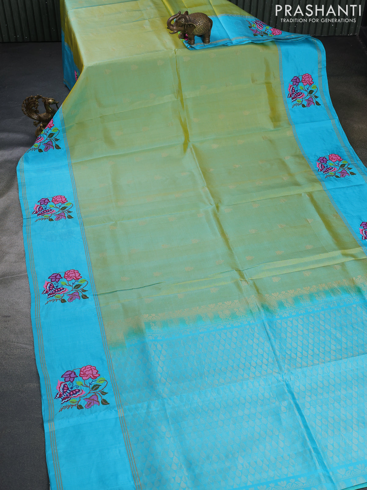 Pure soft silk saree dual shade of teal bluish yellow and teal blue with zari woven floral buttas and zari woven embroidery butta border