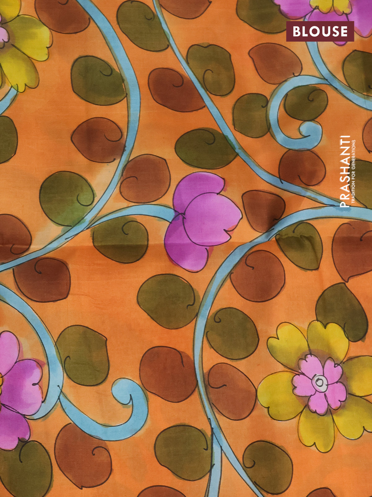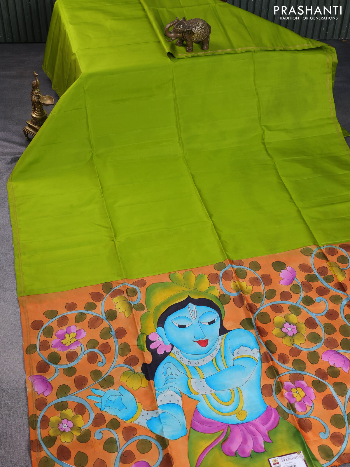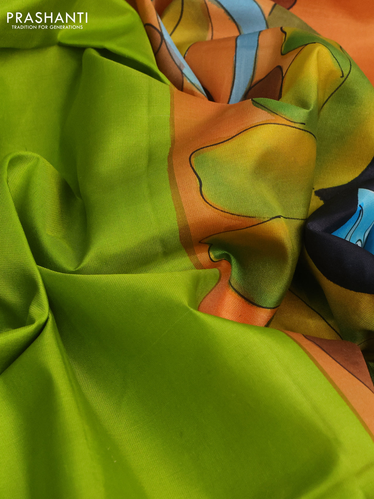 Pure soft silk saree light green and orange with plain body and kalamkari hand painted pallu & blouse