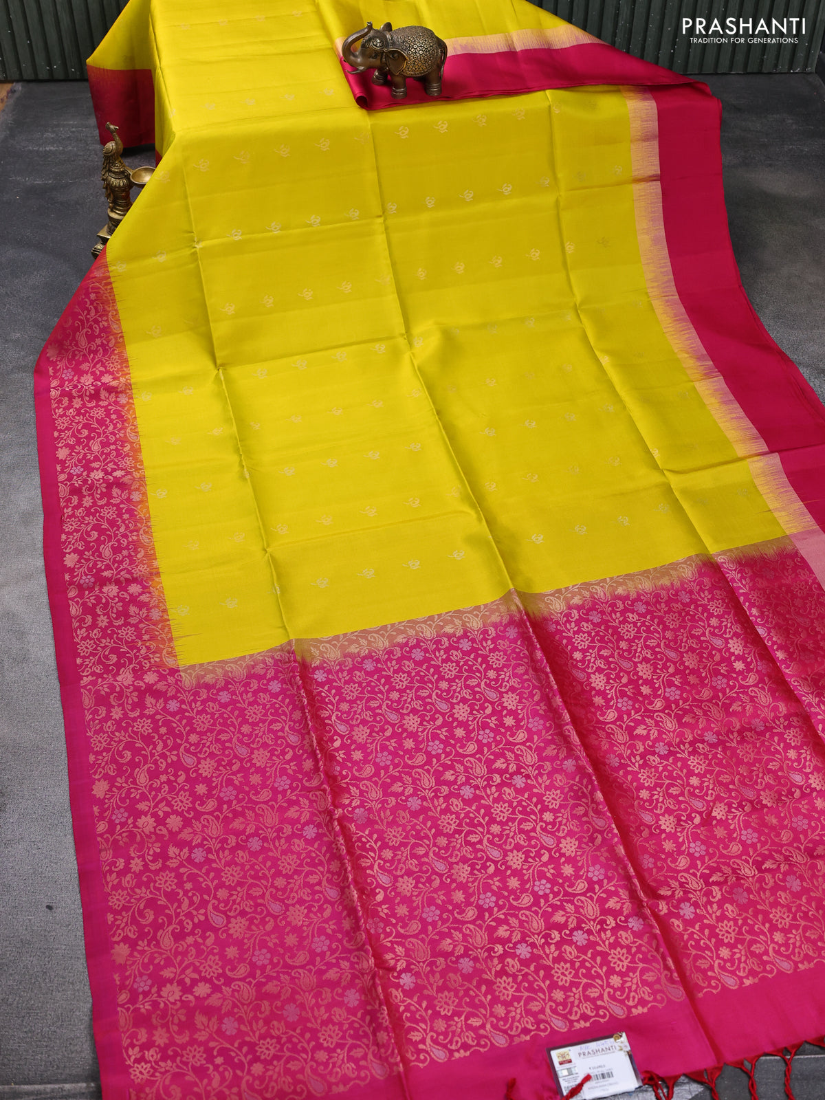 Pure soft silk saree lime yellow and dual shade of pink with allover silver & gold zari woven buttas and zari woven border
