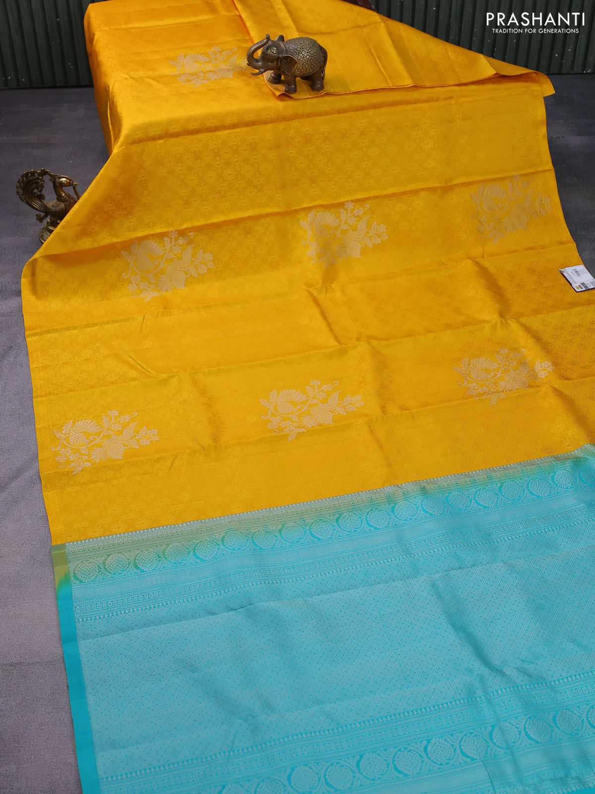 Pure soft silk saree mustard yellow and teal blue with allover self emboss in borderless style