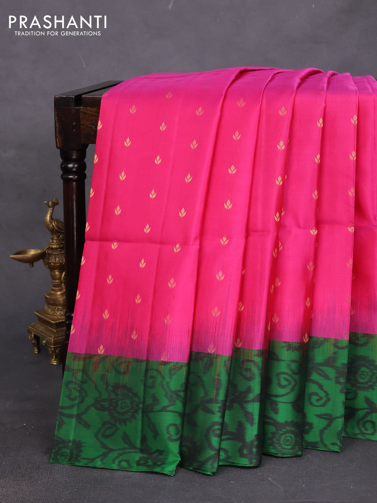 Pure soft silk saree pink and green with allover zari woven buttas and ikat syle border