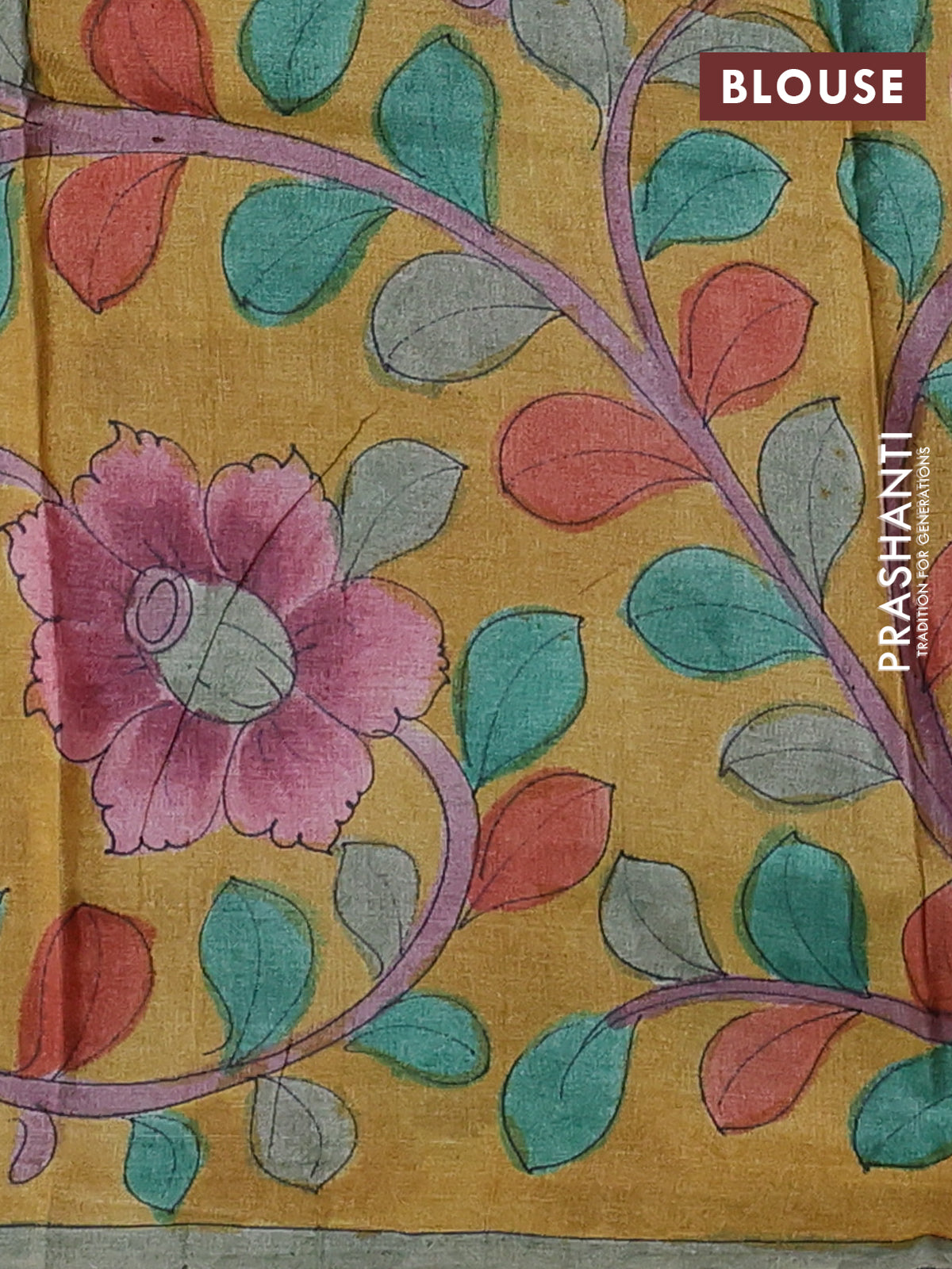Pure tussar partly silk saree blue and mustard yellow with plain body and kalamkari hand painted prints
