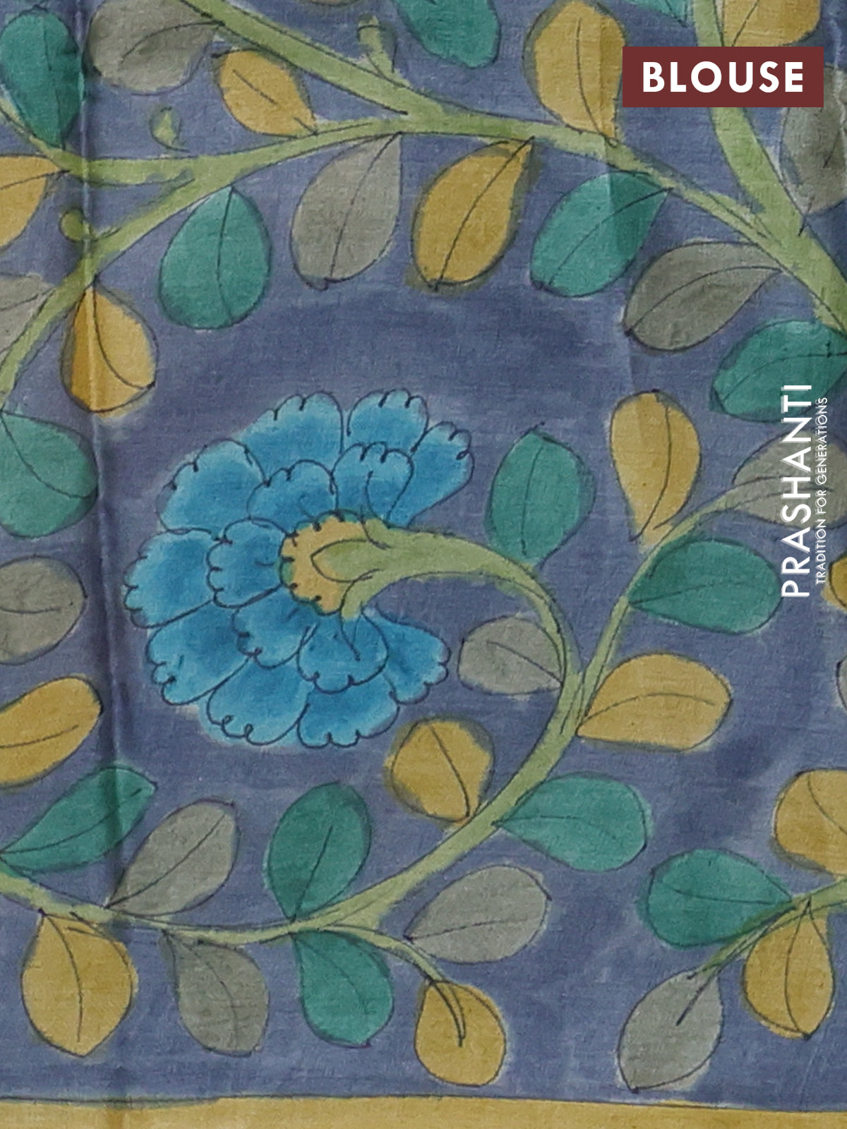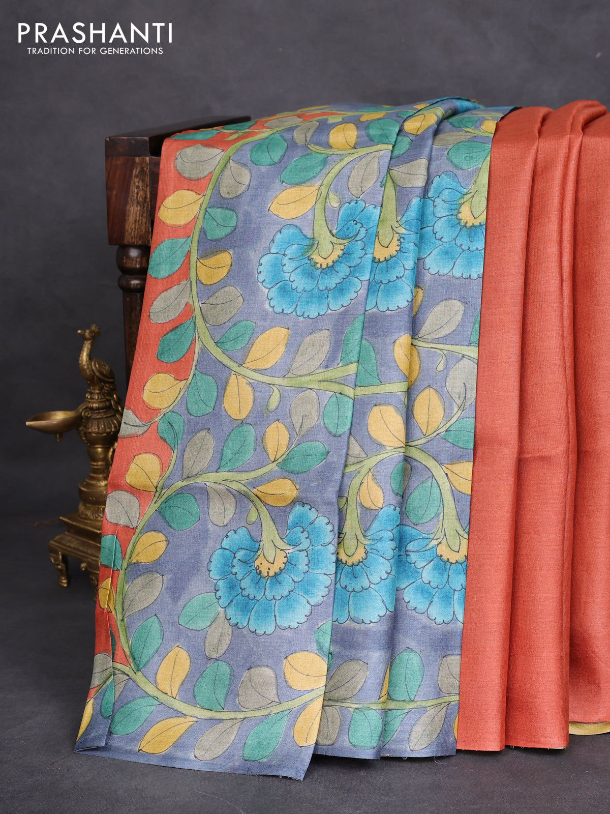 Pure tussar partly silk saree grey shade and rustic orange with plain body and kalamkari hand painted prints