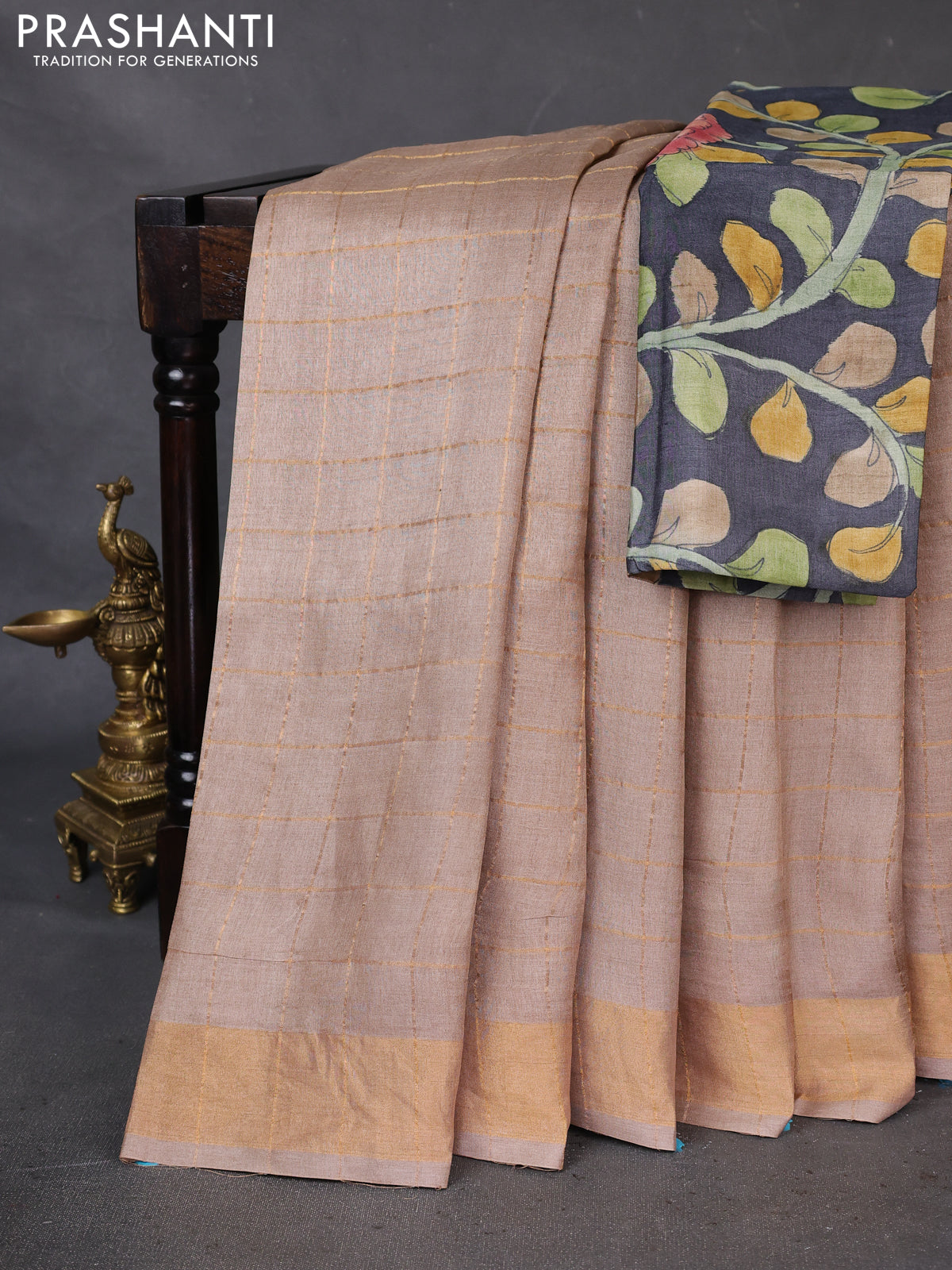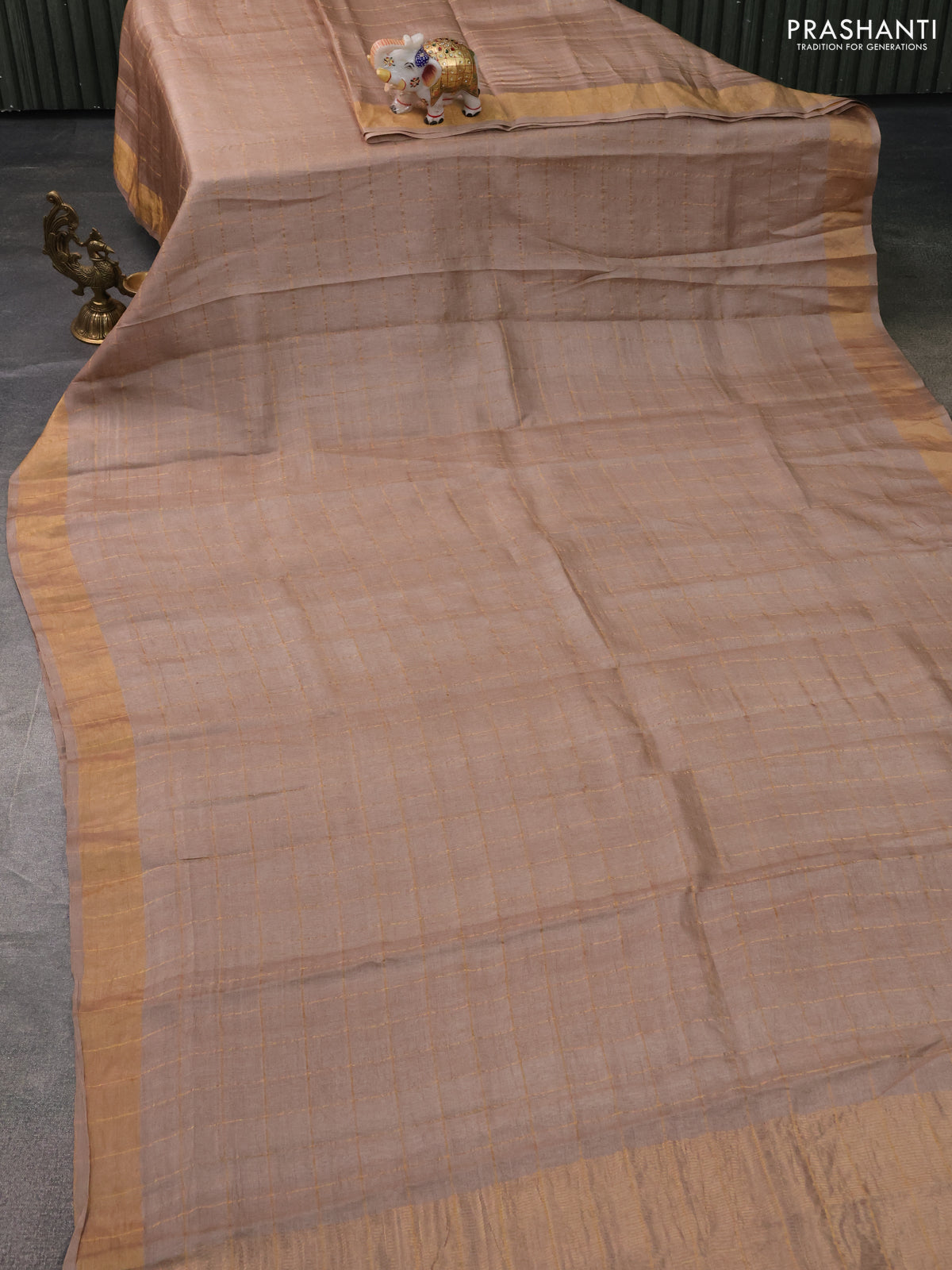 Pure Tussar Silk Saree beige with allover zari checked pattern and zari woven border