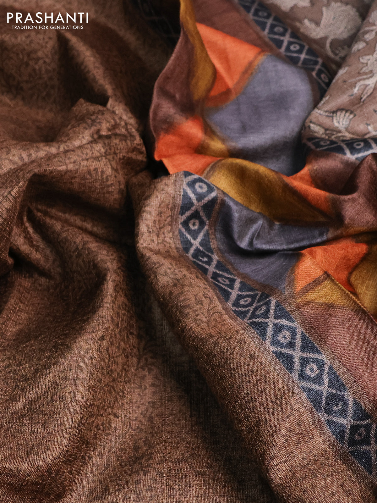 Pure tussar silk saree brown and multi colour with allover prints and printed border