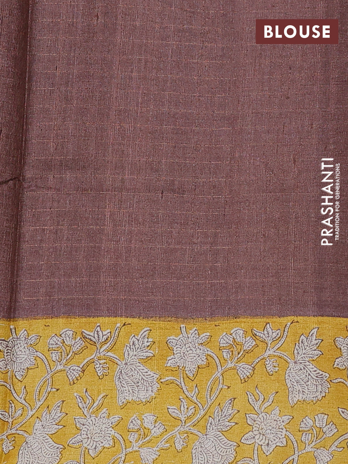 Pure tussar silk saree brown and yellow with allover zari checked pattern and kalamkari printed border