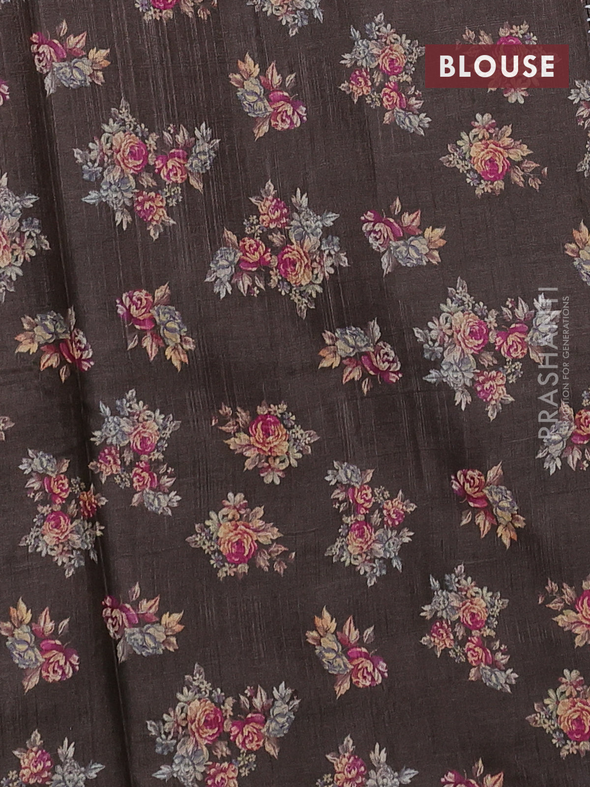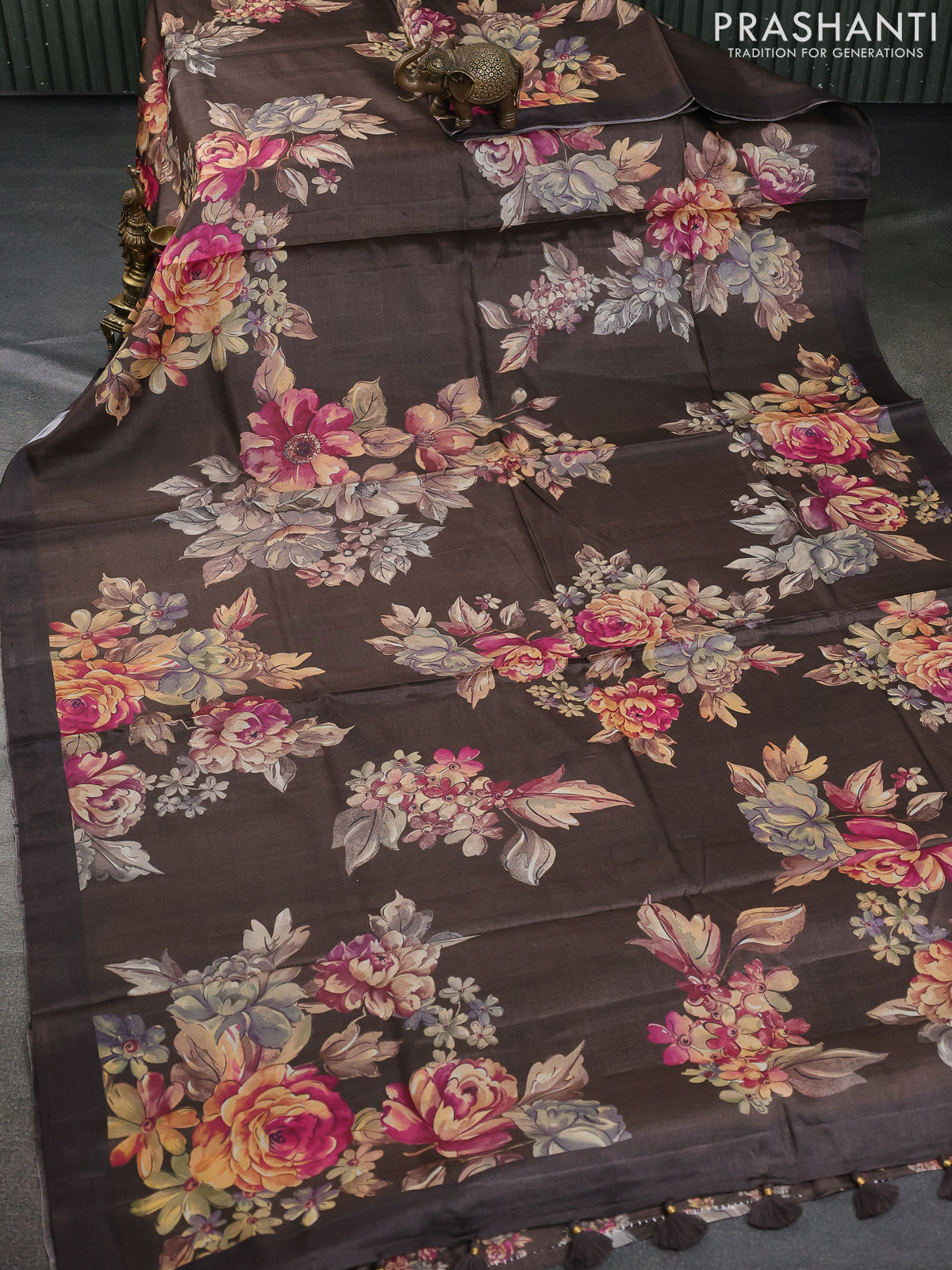 Pure tussar silk saree brown with allover floral digital prints in borderless style