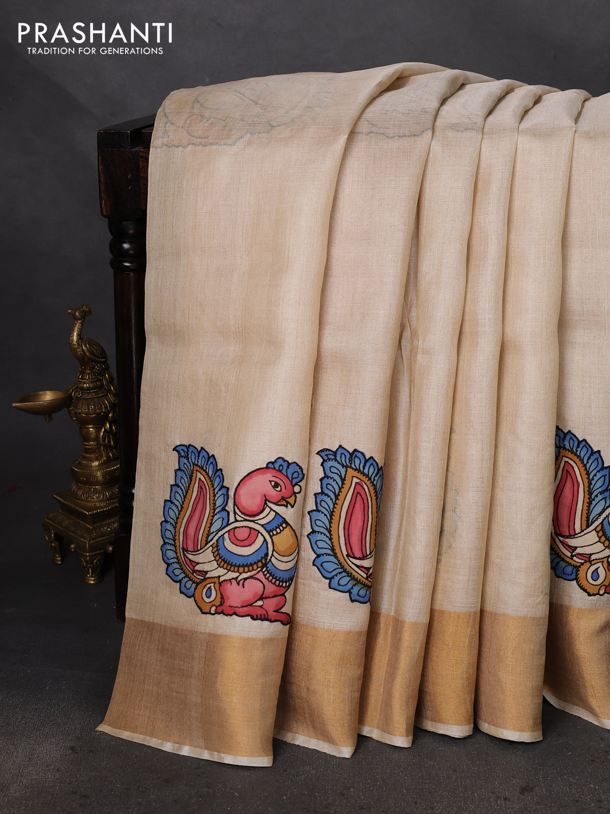 Pure tussar silk saree cream with kalamkari applique work