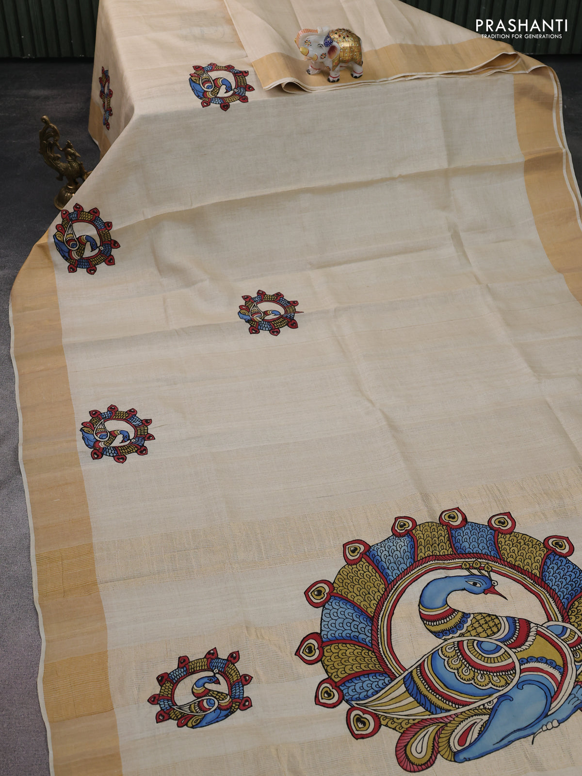 Pure tussar silk saree cream with kalamkari applique work