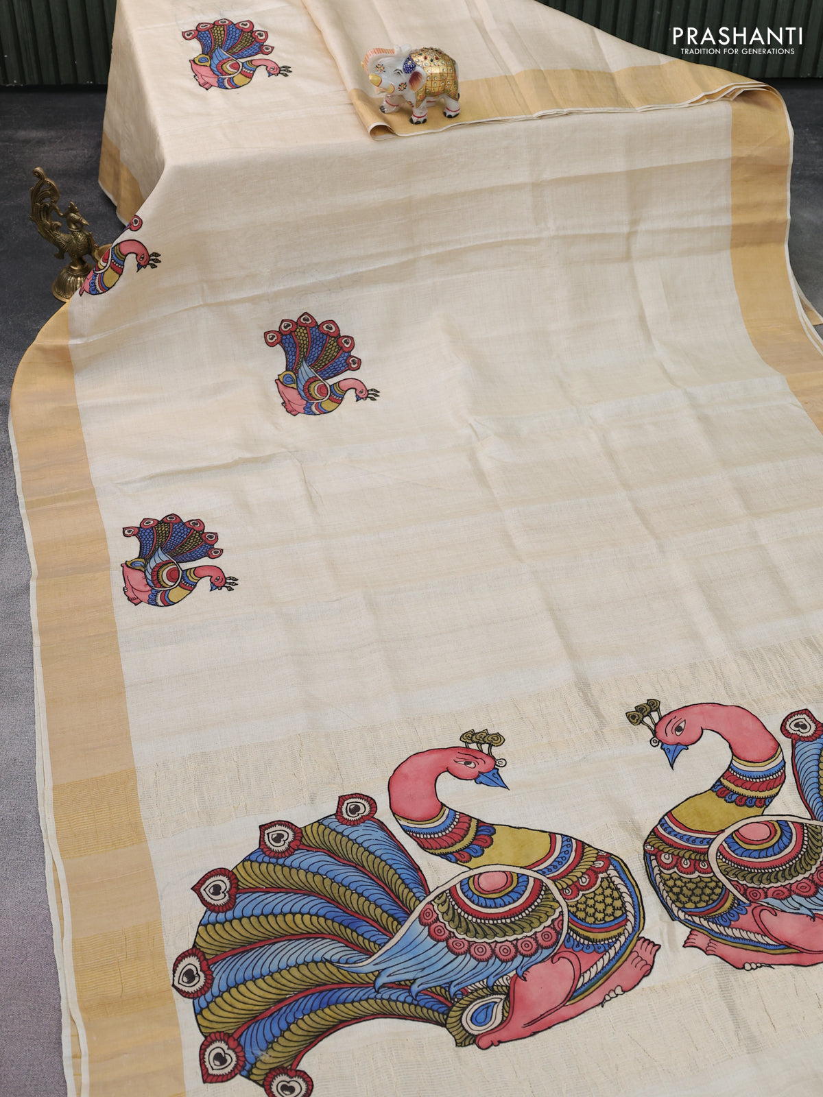Pure tussar silk saree cream with kalamkari applique work