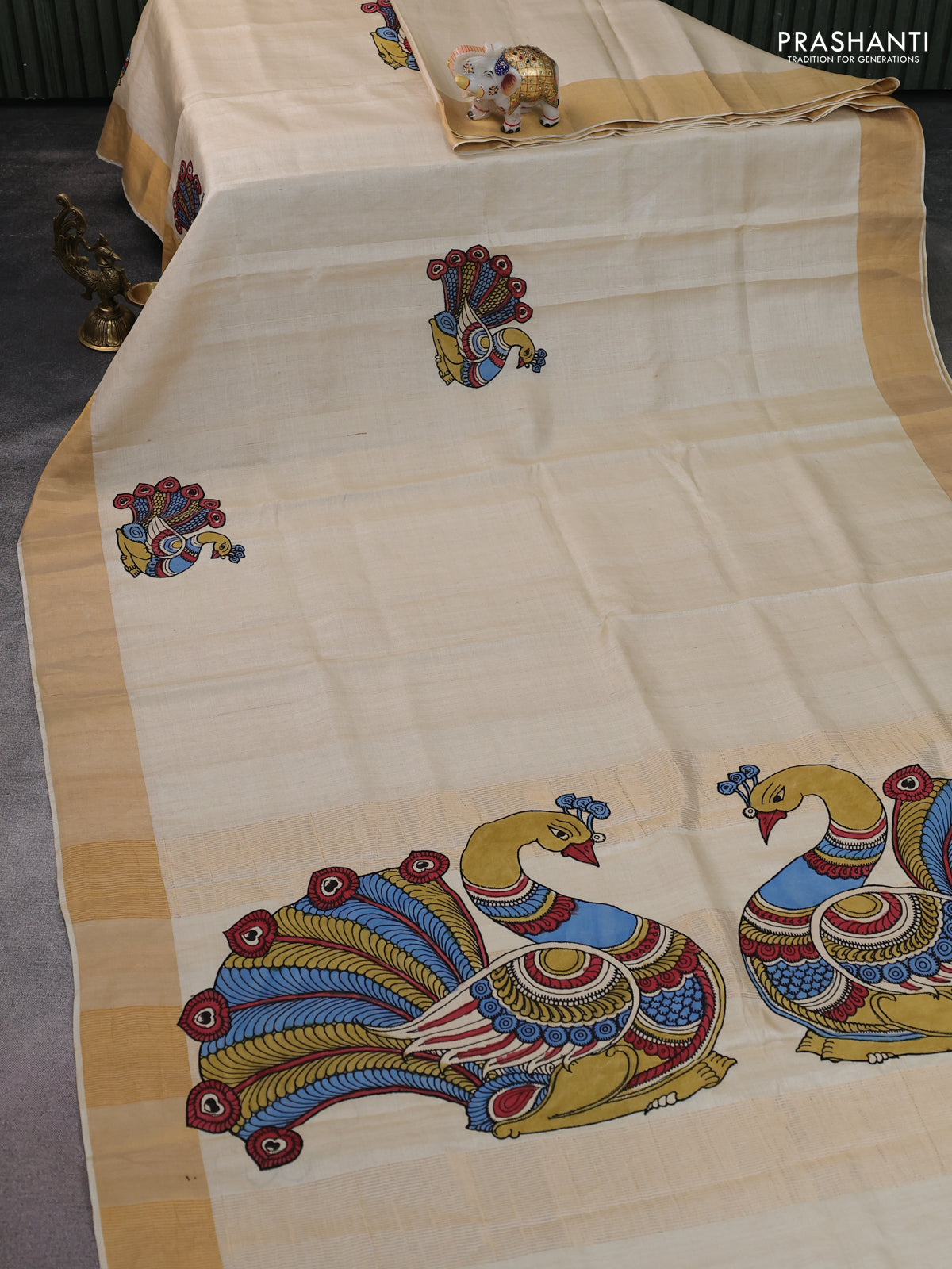 Pure tussar silk saree cream with kalamkari applique work