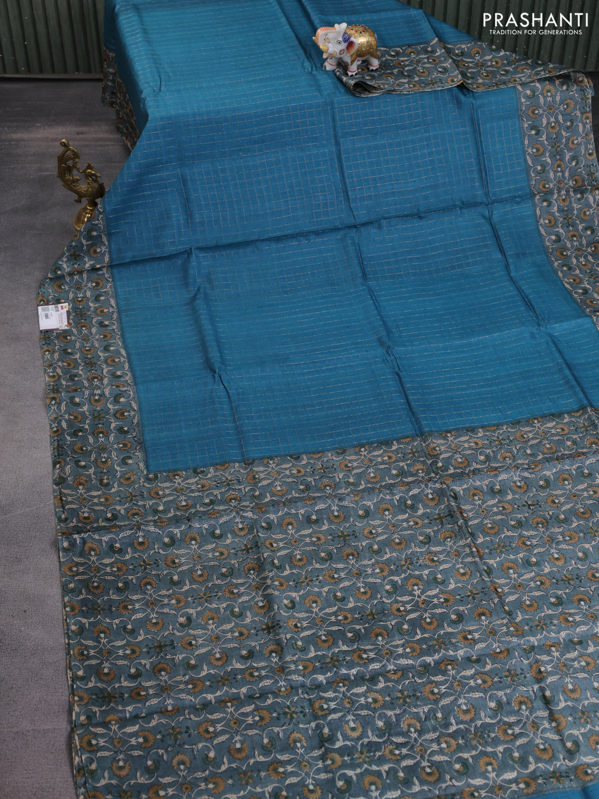 Pure tussar silk saree cs blue and grey with allover zari checked pattern and kalamkari printed border