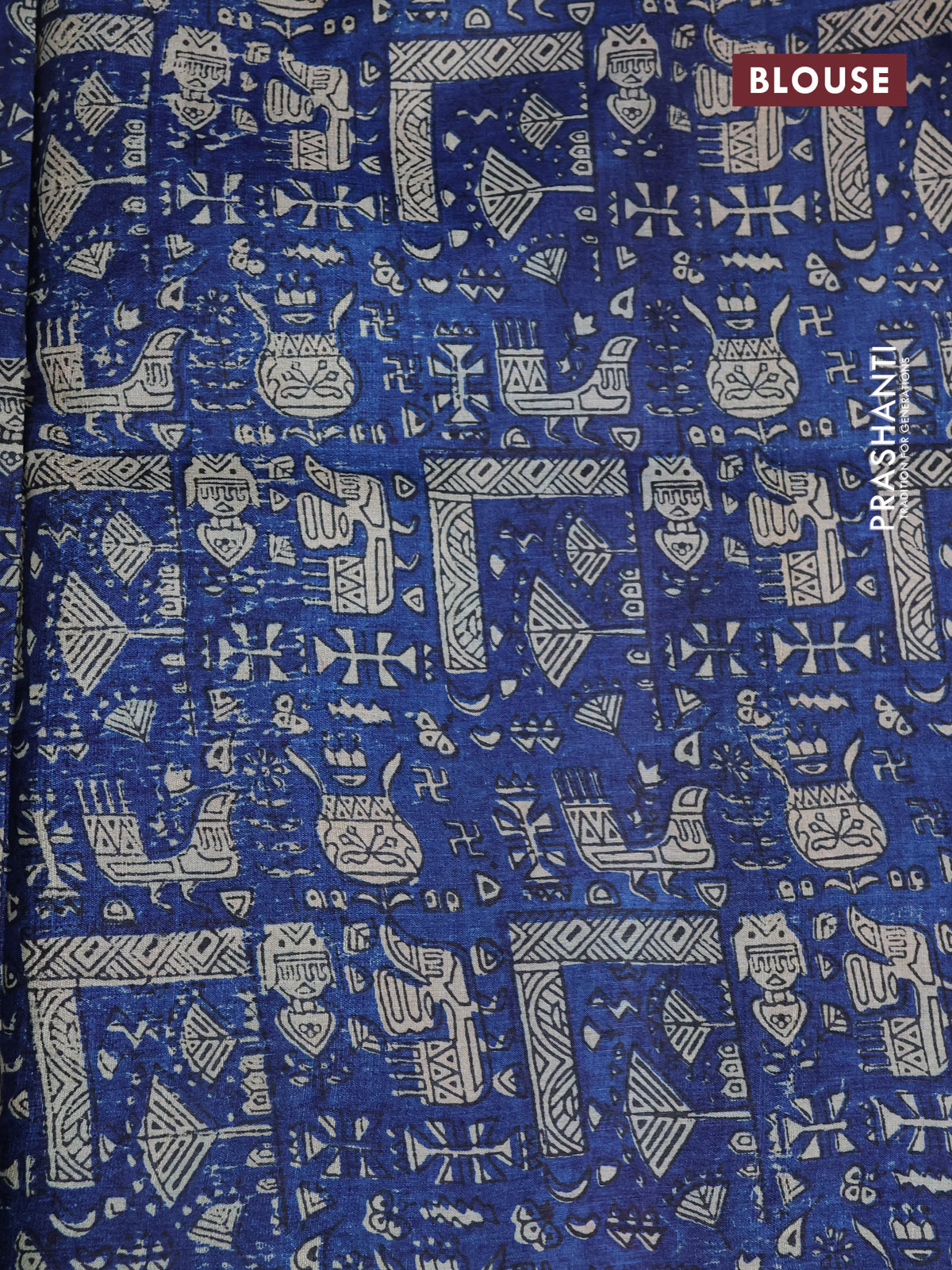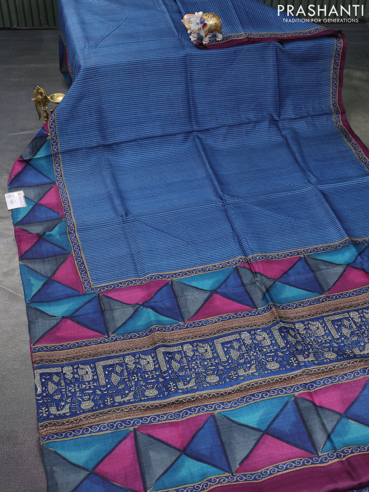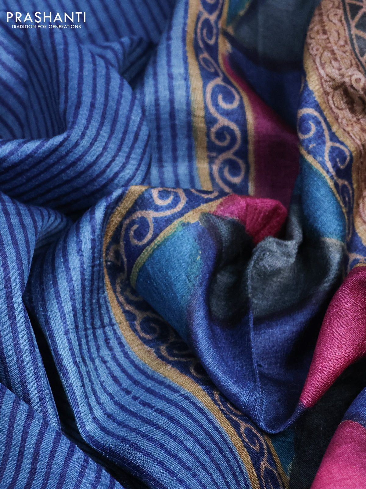 Pure tussar silk saree cs blue and multi colour with allover stripes pattern and printed border