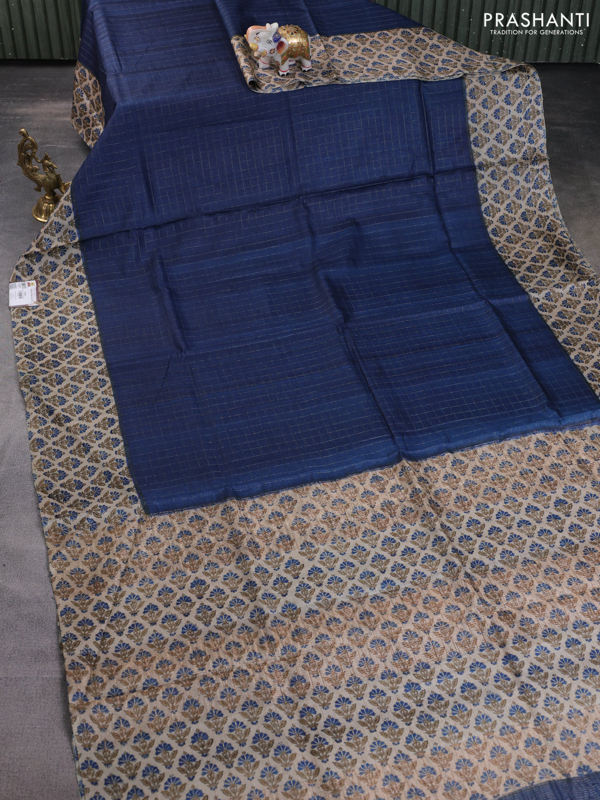 Pure tussar silk saree dark blue and beige with allover zari checked pattern and printed butta border