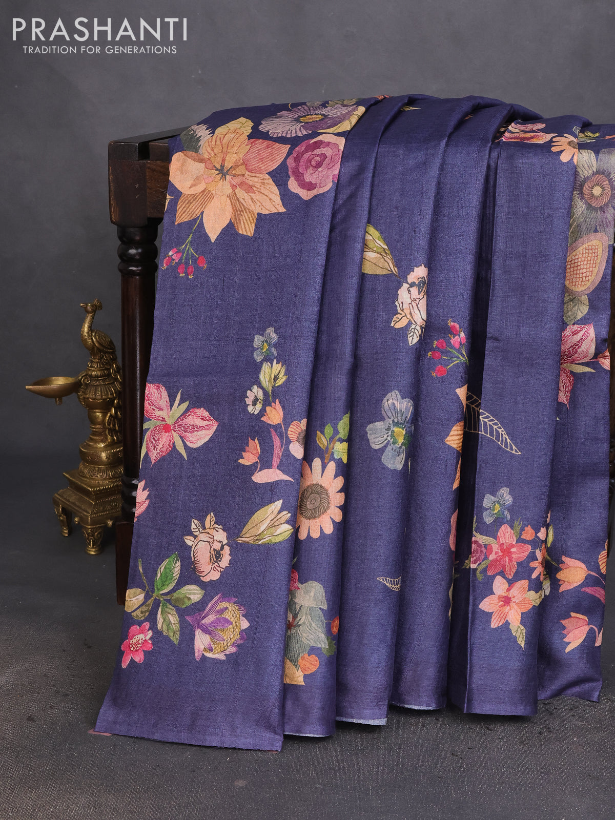 Pure tussar silk saree dark blue with allover floral digital prints in borderless style
