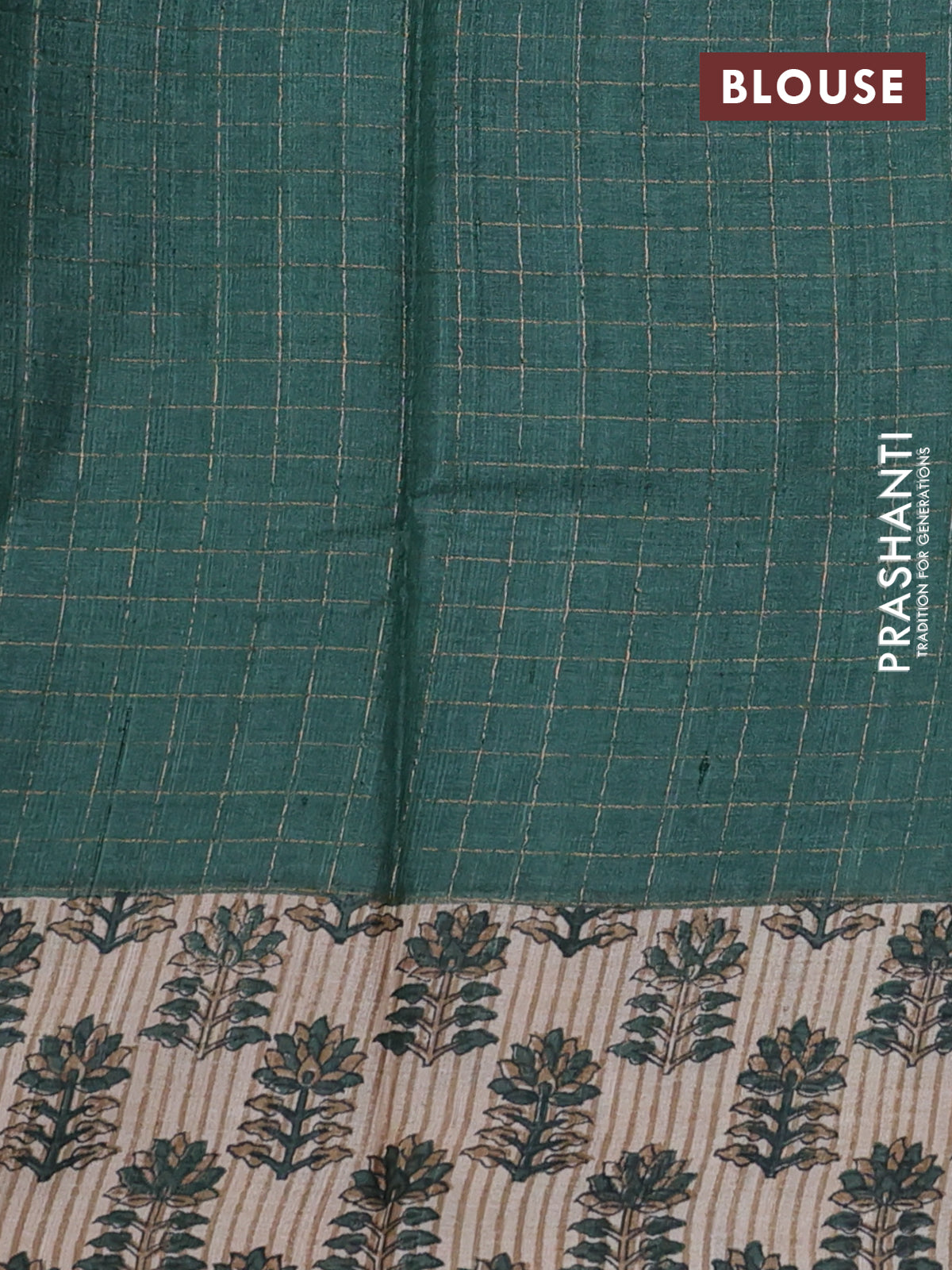 Pure tussar silk saree dark green and beige with allover zari checked pattern and floral printed border
