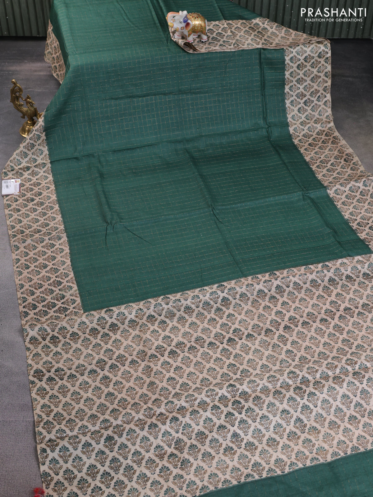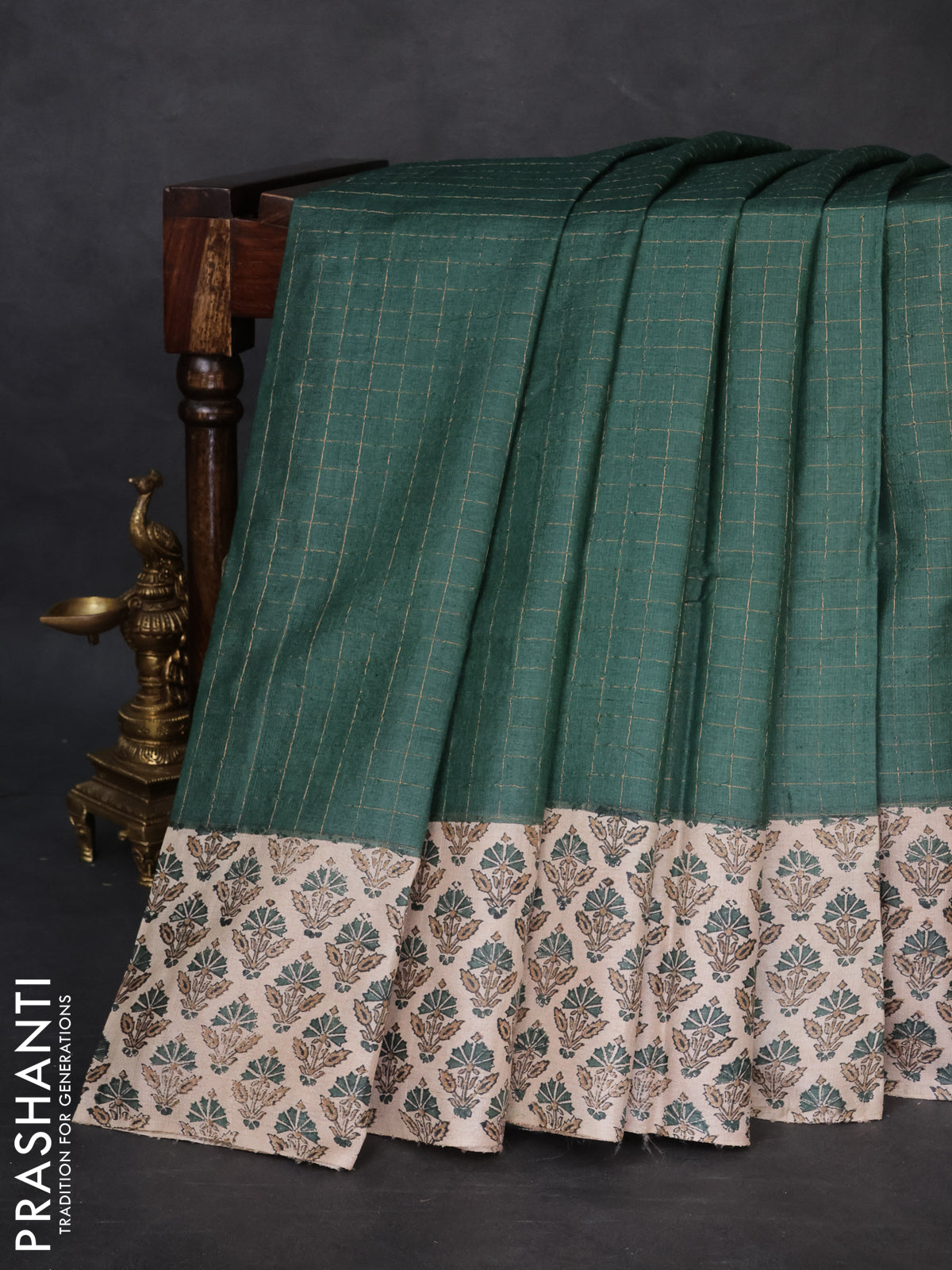 Pure tussar silk saree dark green and beige with allover zari checked pattern and printed butta border