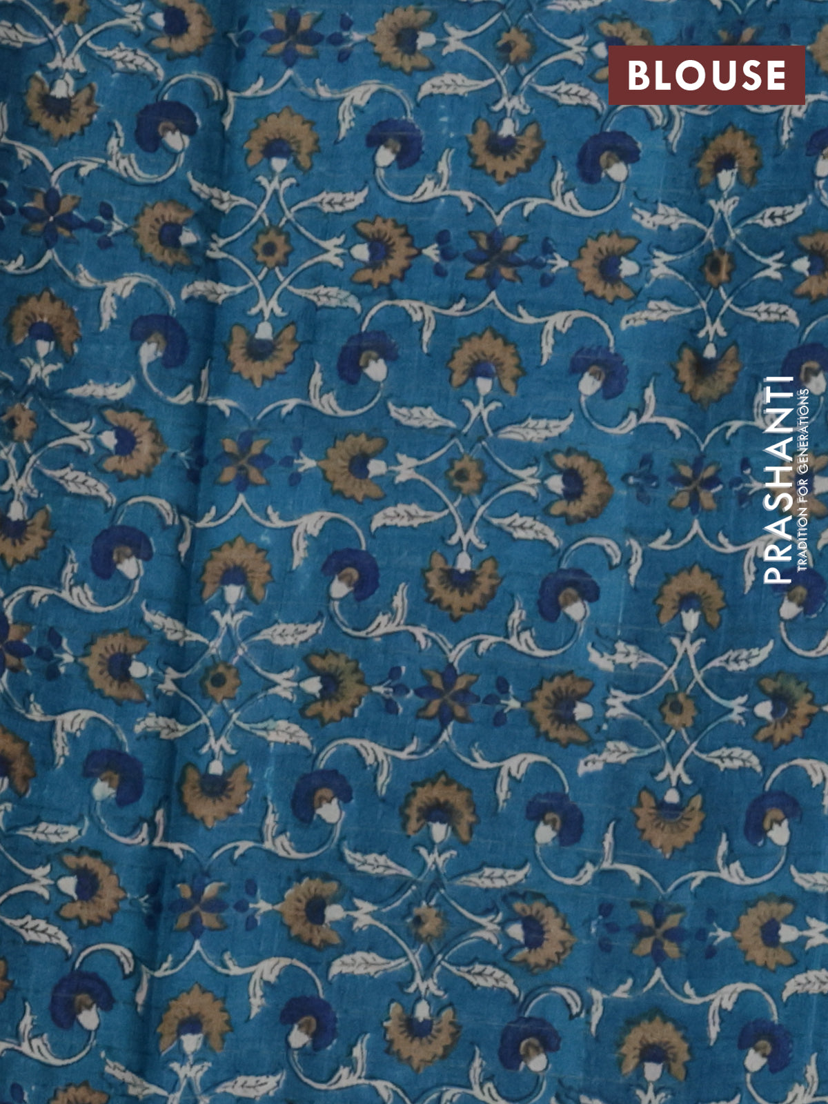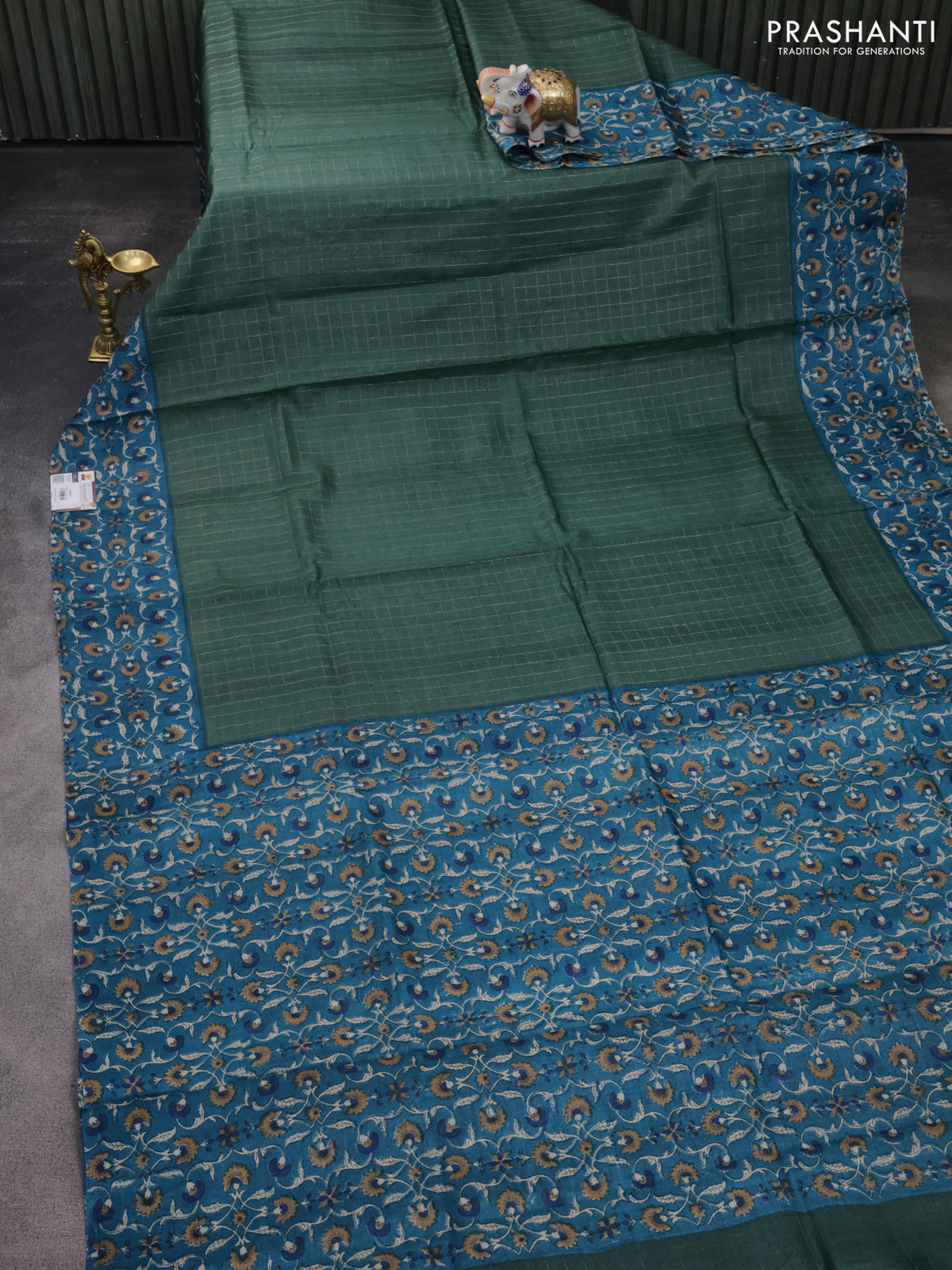 Pure tussar silk saree dark green and cs blue with allover zari checked pattern and kalamkari printed border